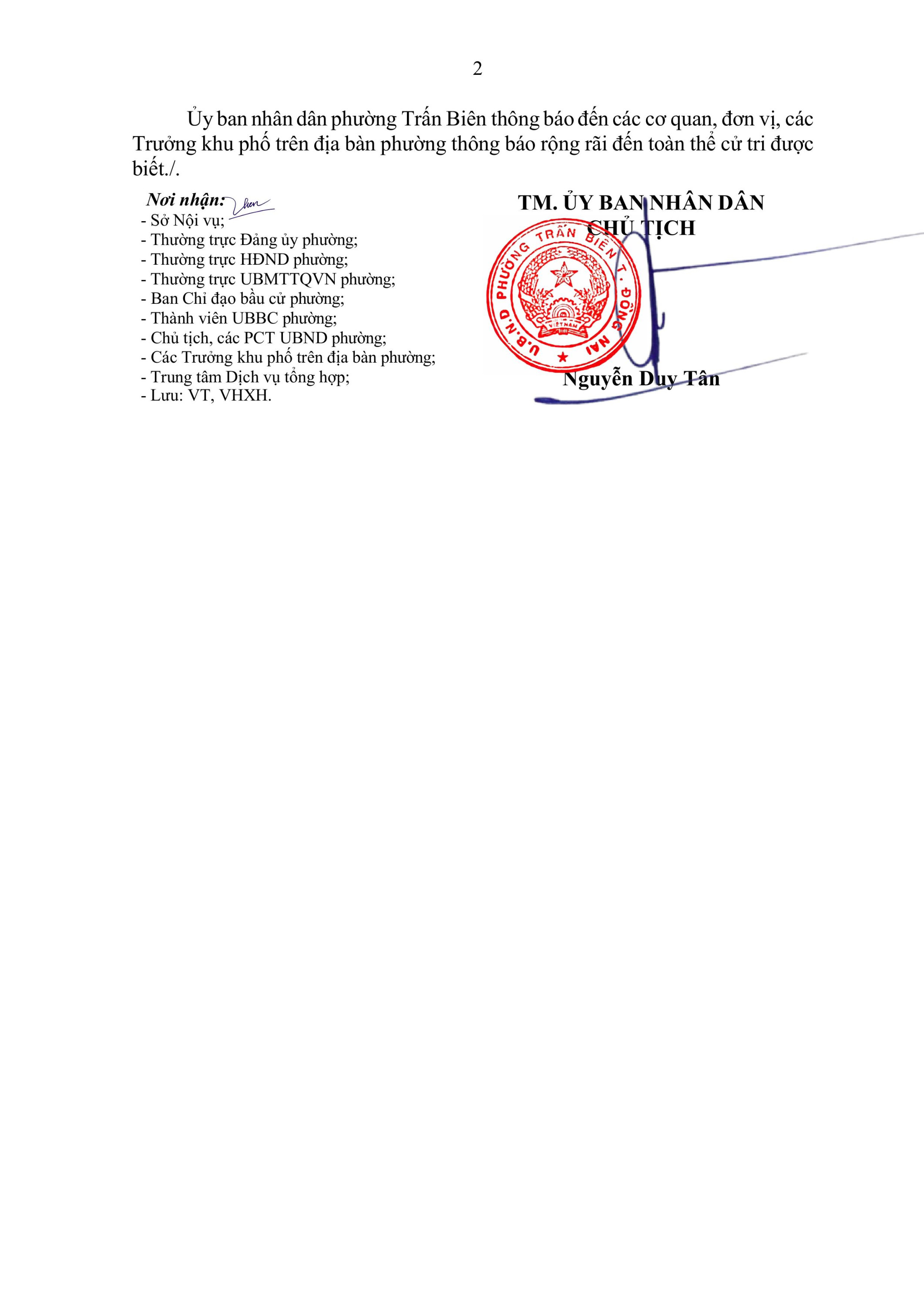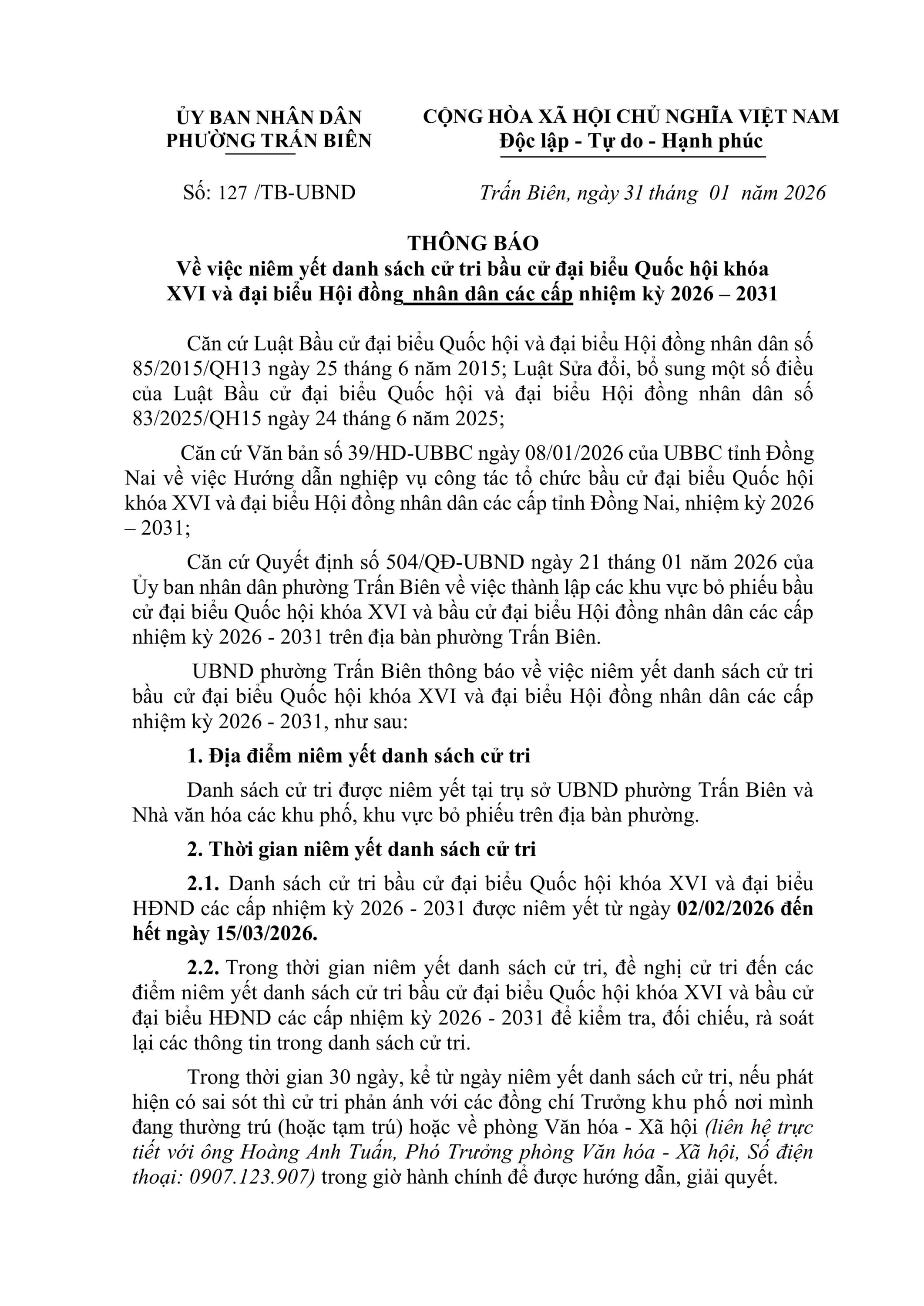 UBND phường Trấn Biên thông báo về việc niêm yết danh sách cử tri bầu cử đại biểu Quốc hội khóa XVI và đại biểu Hội đồng nhân dân các cấp nhiệm kỳ 2026 - 2031, như sau: