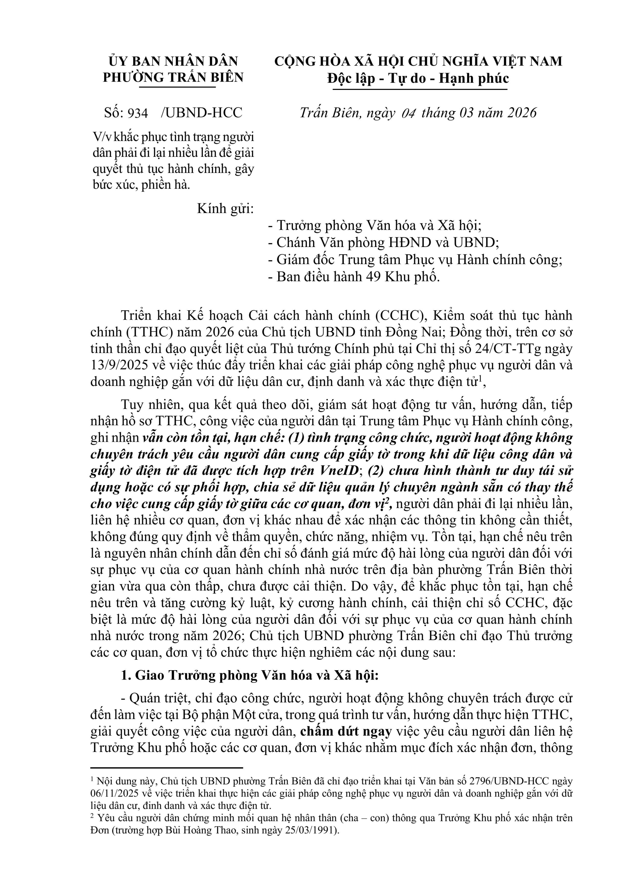 Triển khai Kế hoạch Cải cách hành chính (CCHC), Kiểm soát thủ tục hành chính (TTHC) năm 2026 của Chủ tịch UBND tỉnh Đồng Nai; Đồng thời, trên cơ sở tinh thần chỉ đạo quyết liệt của Thủ tướng Chính phủ tại Chỉ thị số 24/CT-TTg ngày 13/9/2025 về việc thúc đẩy triển khai các giải pháp công nghệ phục vụ người dân và doanh nghiệp gắn với dữ liệu dân cư, định danh và xác thực điện tử.