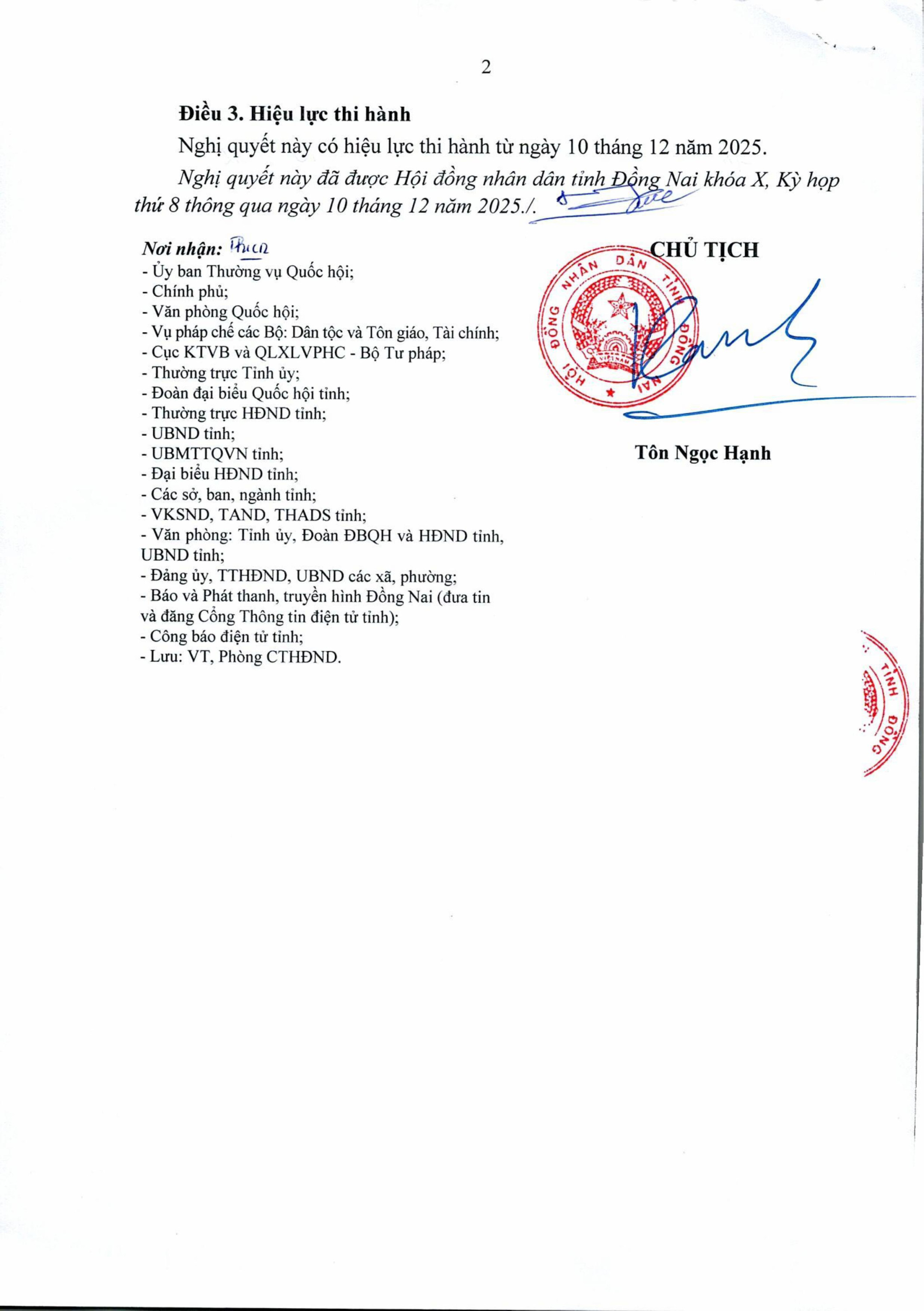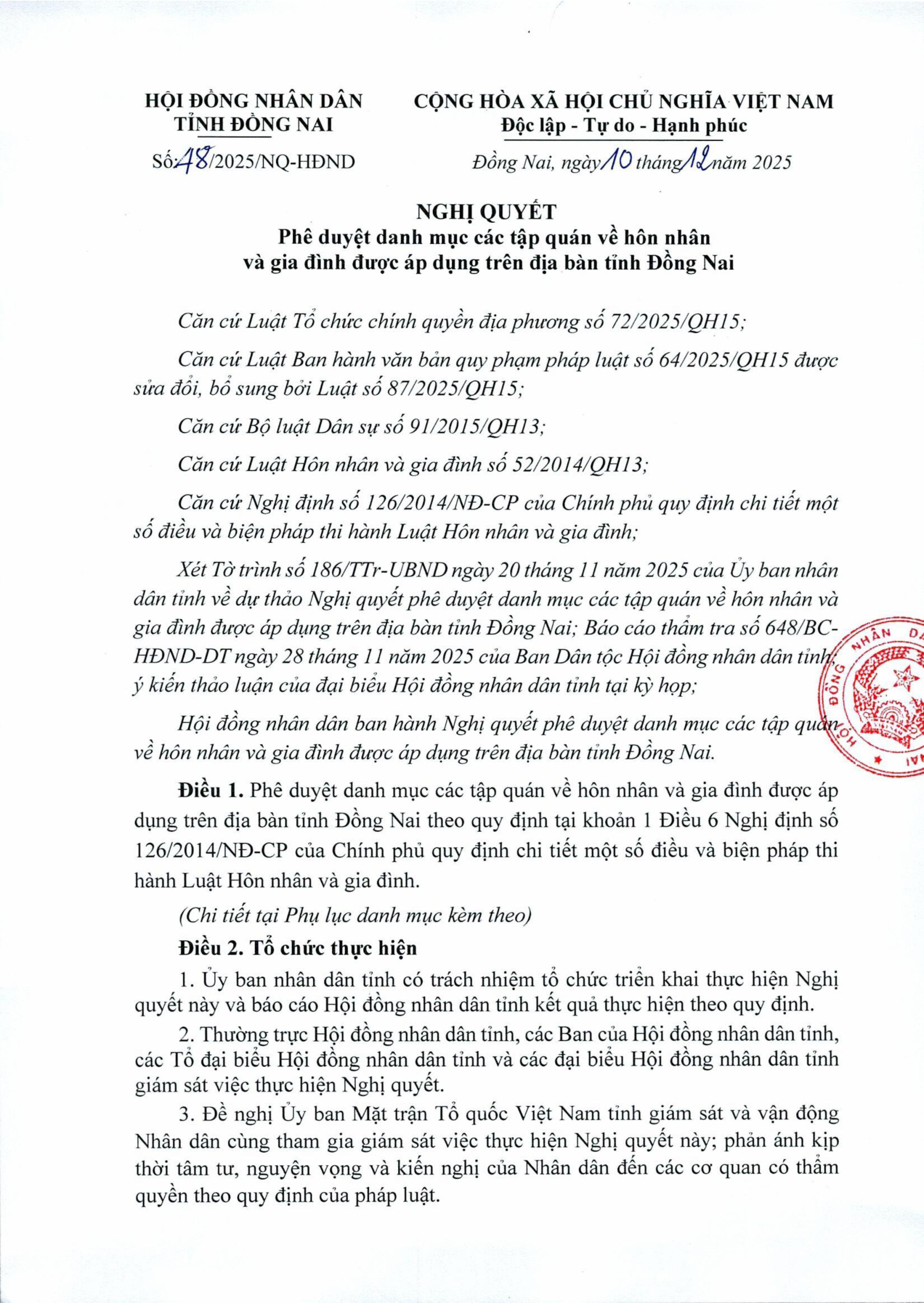 Ngày 10/12/2025, Hội đồng nhân dân tỉnh Đồng Nai ban hành Nghị quyết số 48/2025/NQ-HĐND về việc phê duyệt danh mục các tập quán về hôn nhân và gia đình được áp dụng trên địa bàn tỉnh Đồng Nai. Nghị quyết có hiệu lực thi hành kể từ ngày 10/12/2025, kèm theo Phụ lục danh mục các tập quán của các dân tộc trên địa bàn tỉnh.