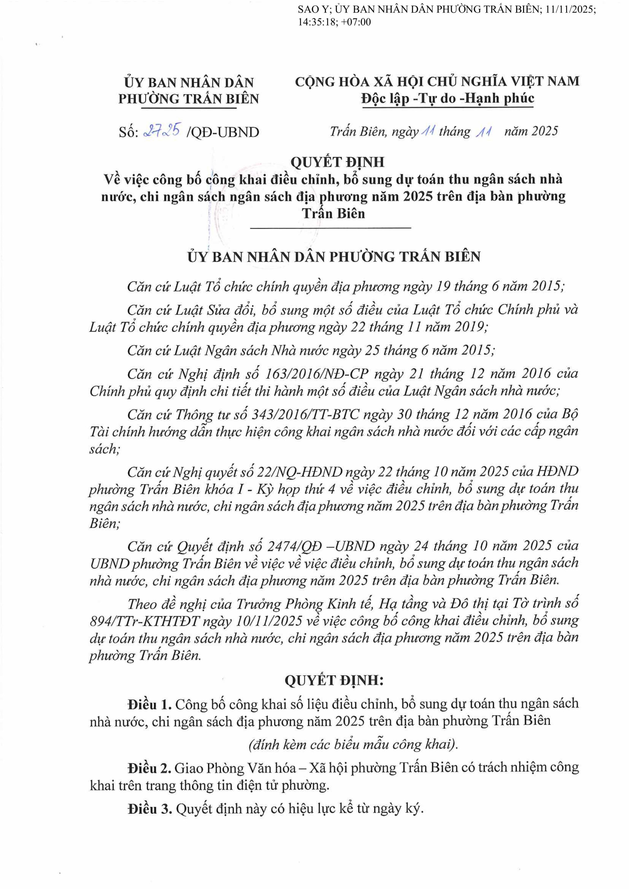 Quyết định 2725/QĐ-UBND ngày 12/11/2025 của UBND phường Trấn Biên về việc công bố công khai điều chỉnh, bổ sung dự toán thu ngân sách nhà nước, chi ngân sách địa phương năm 2025 trên địa bàn phường Trấn Biên.