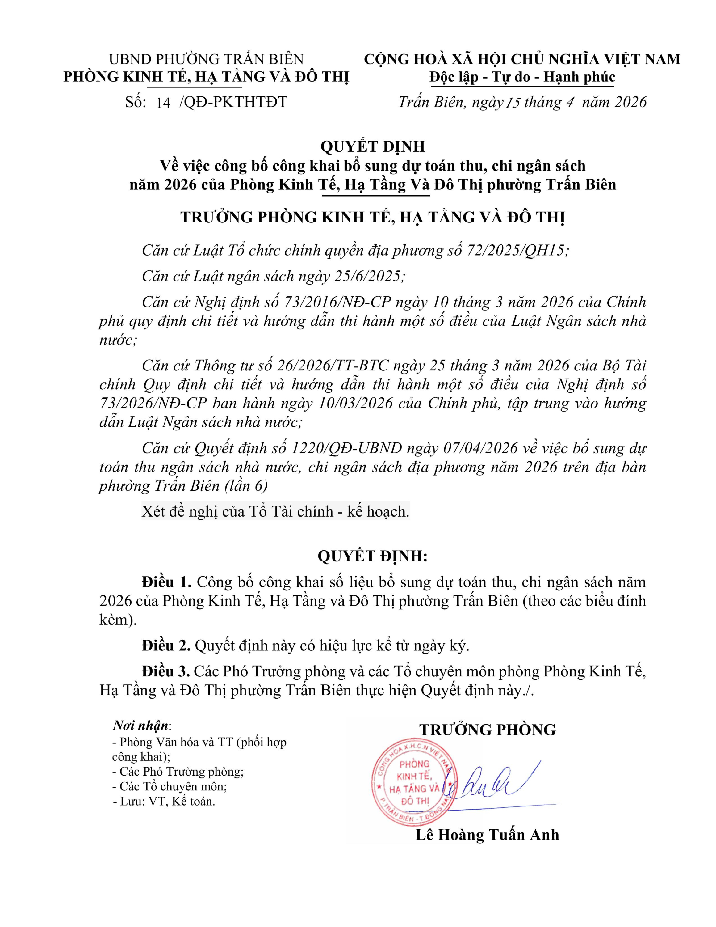 14 /QĐ-PKTHTĐT: Quyết định về việc công bố công khai bổ sung dự toán thu, chi ngân sách năm 2026 của Phòng Kinh Tế, Hạ Tầng Và Đô Thị phường Trấn Biên.