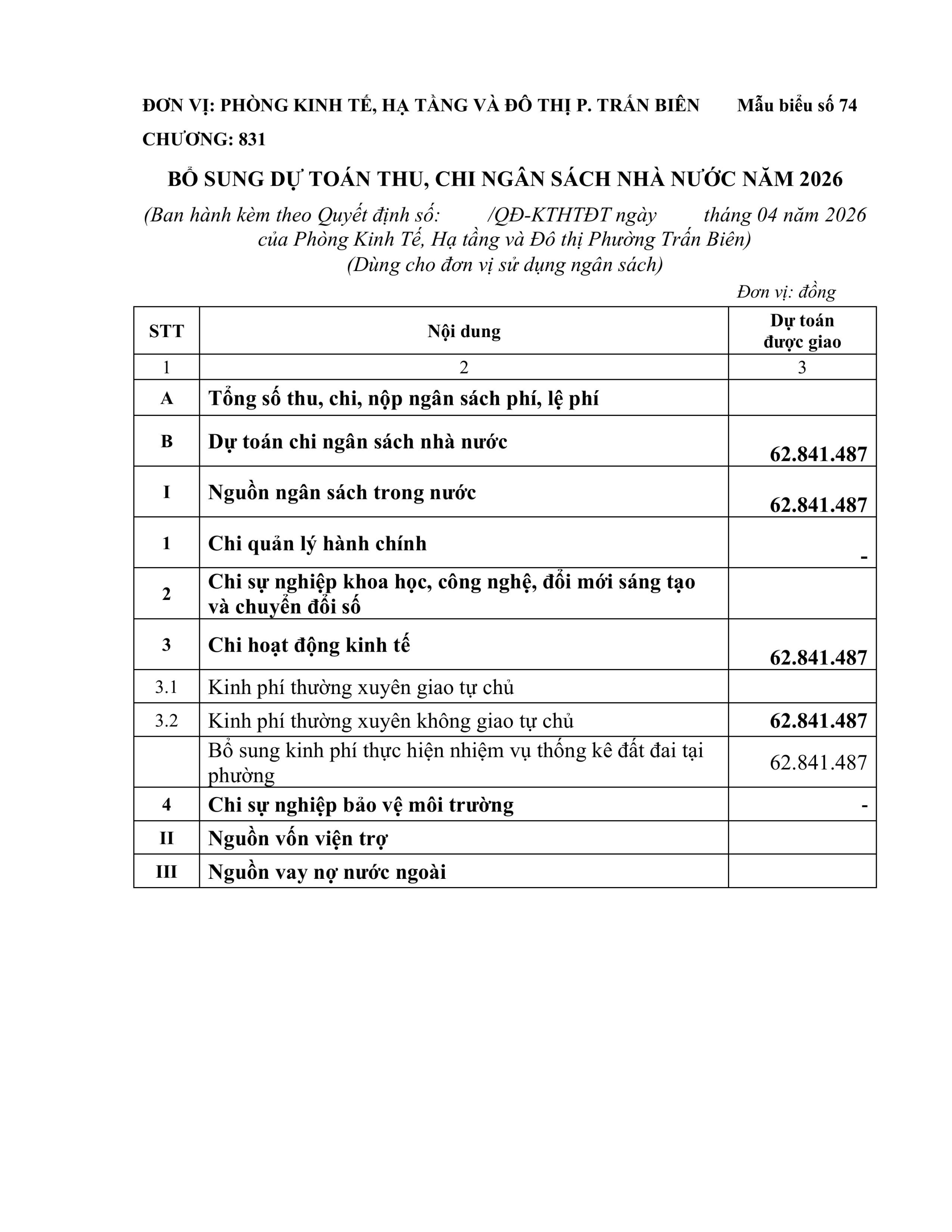 Công khai bổ sung dự toán thu, chi ngân sách năm 2026 của Phòng Kinh Tế, Hạ Tầng Và Đô Thị phường Trấn Biên