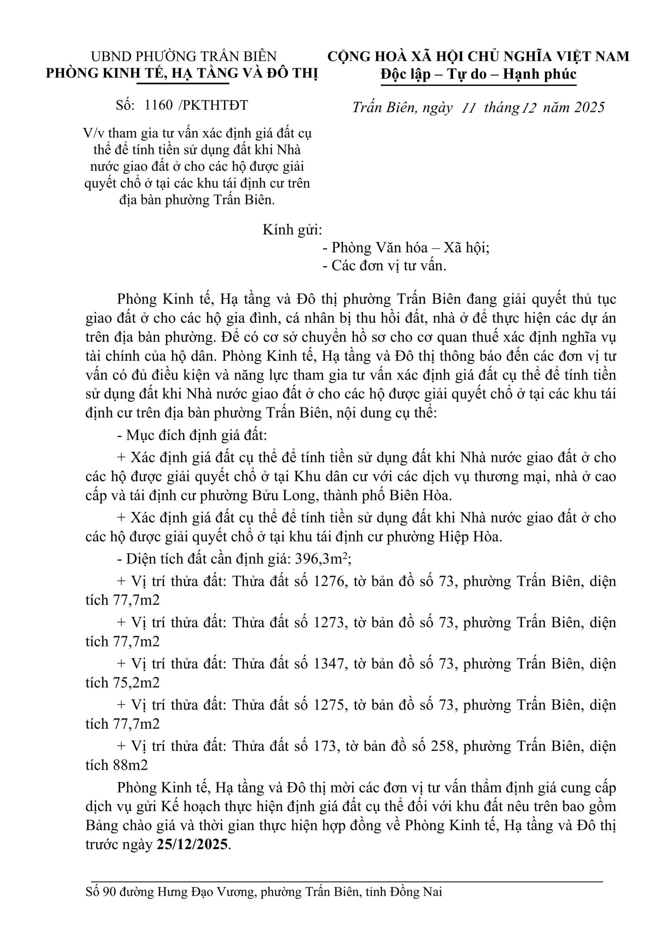 Tham gia tư vấn xác định giá đất cụ thể để tính tiền sử dụng đất khi Nhà nước giao đất ở cho các hộ được giải quyết chổ ở tại các khu tái định cư trên địa bàn phường Trấn Biên