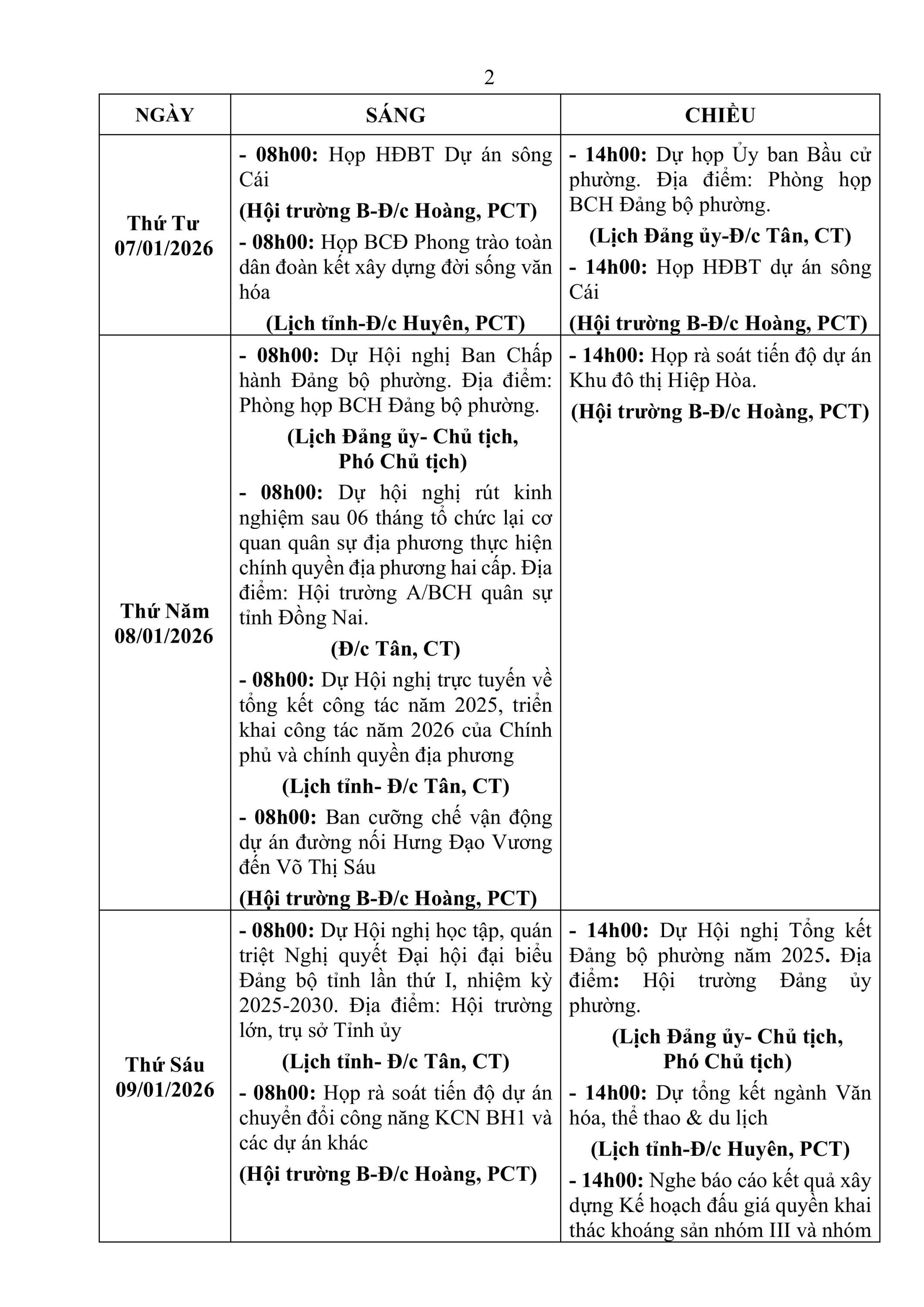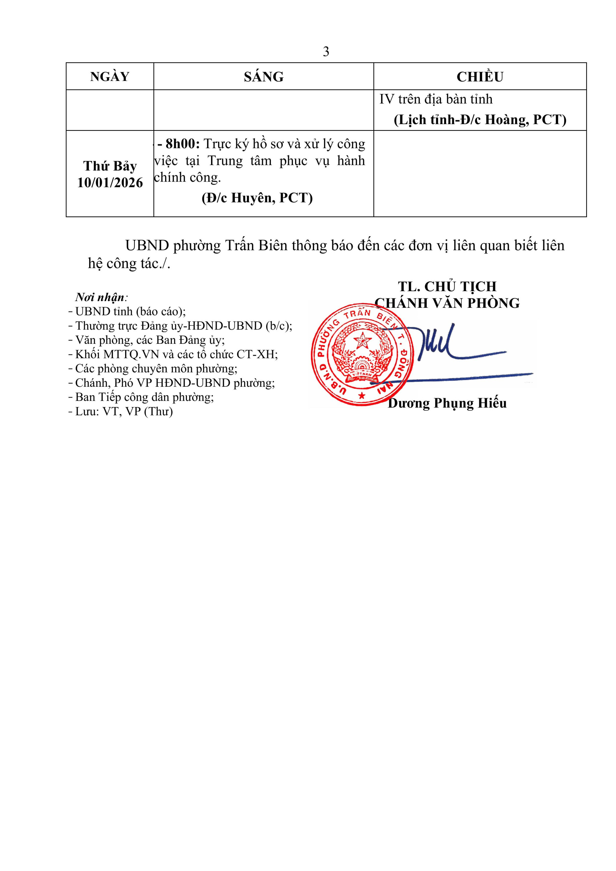 Lịch làm việc của UBND phường Trấn Biên - Tuần 02 (Từ ngày 05/01/2026 đến ngày 10/01/2026)