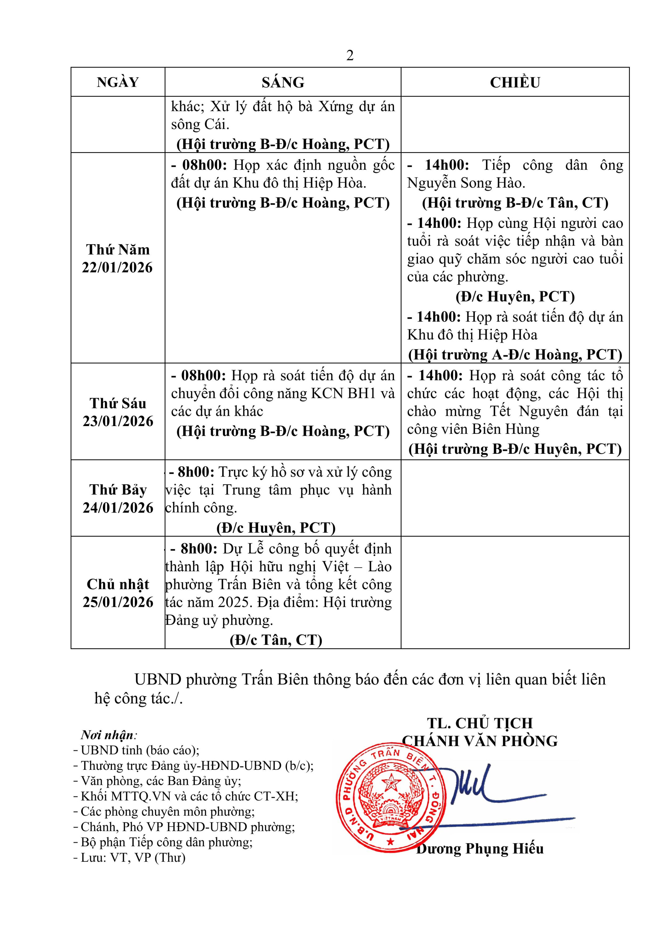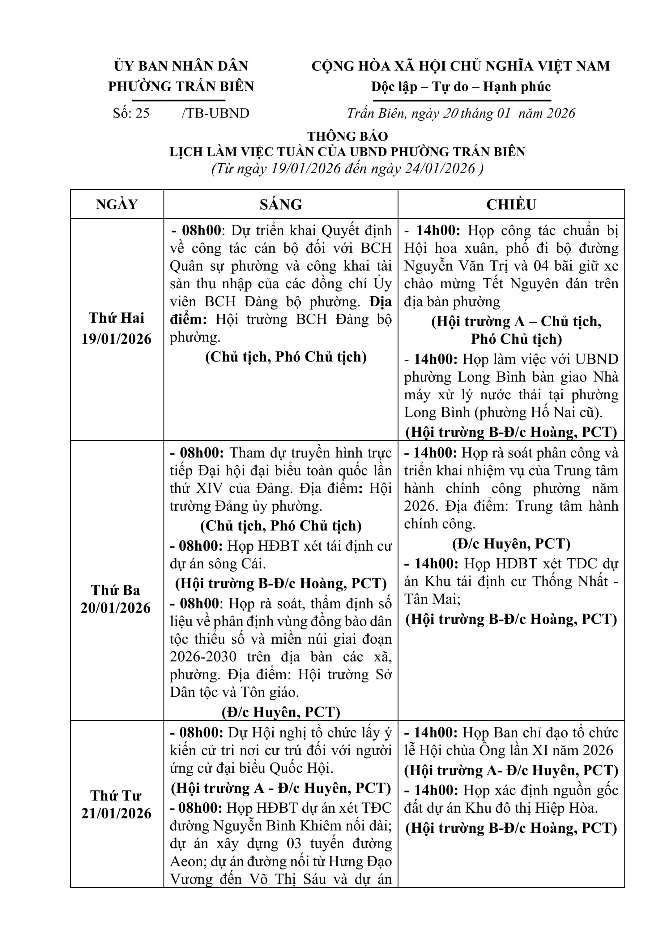 Lịch làm việc của UBND phường Trấn Biên - Tuần 04 (Từ ngày 19/01/2026 đến ngày 24/01/2026)