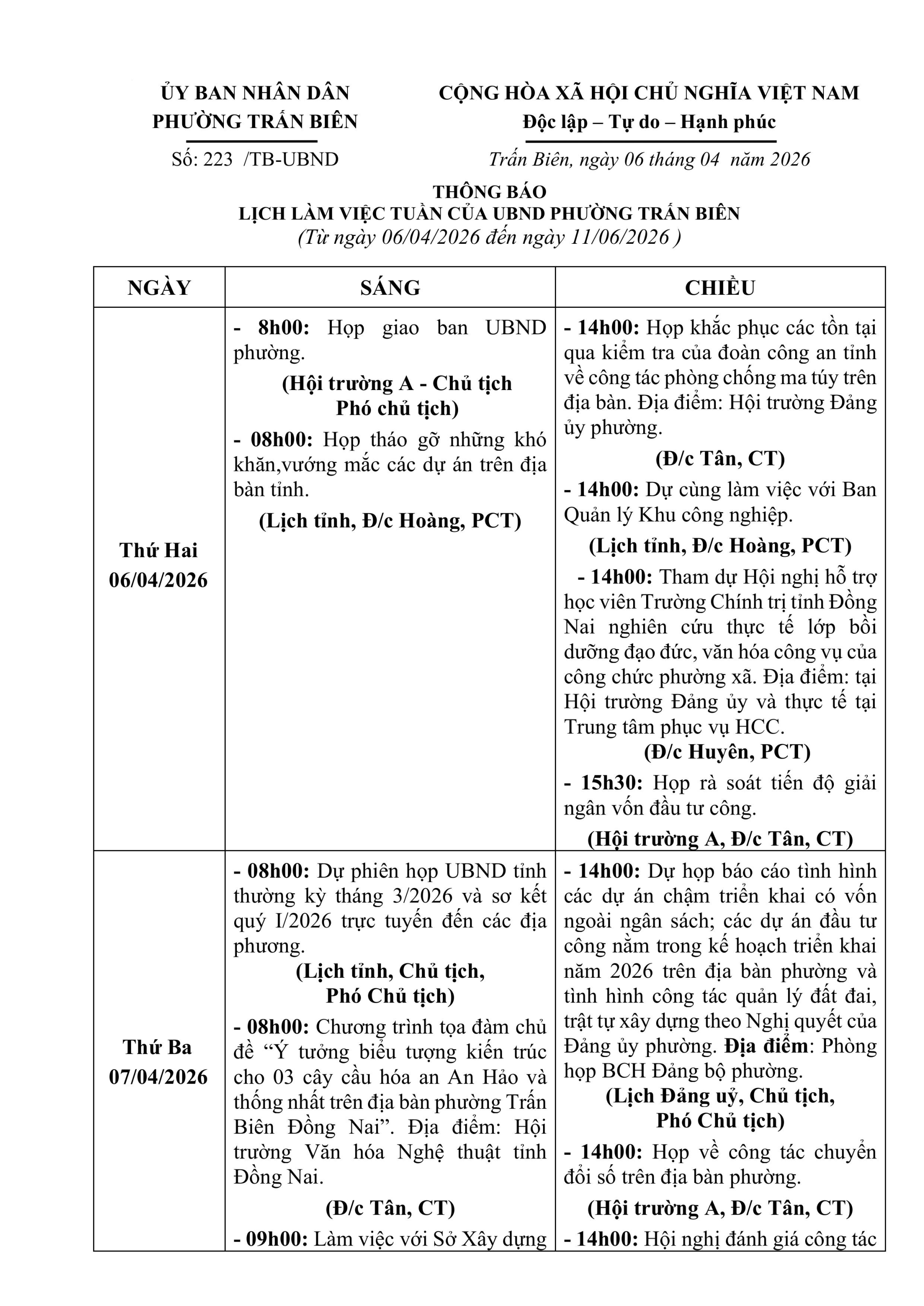 223/TB-UBND: Lịch làm việc của UBND phường Trấn Biên - Tuần 15 (Từ ngày 06/4/2026 đến ngày 11/4/2026)