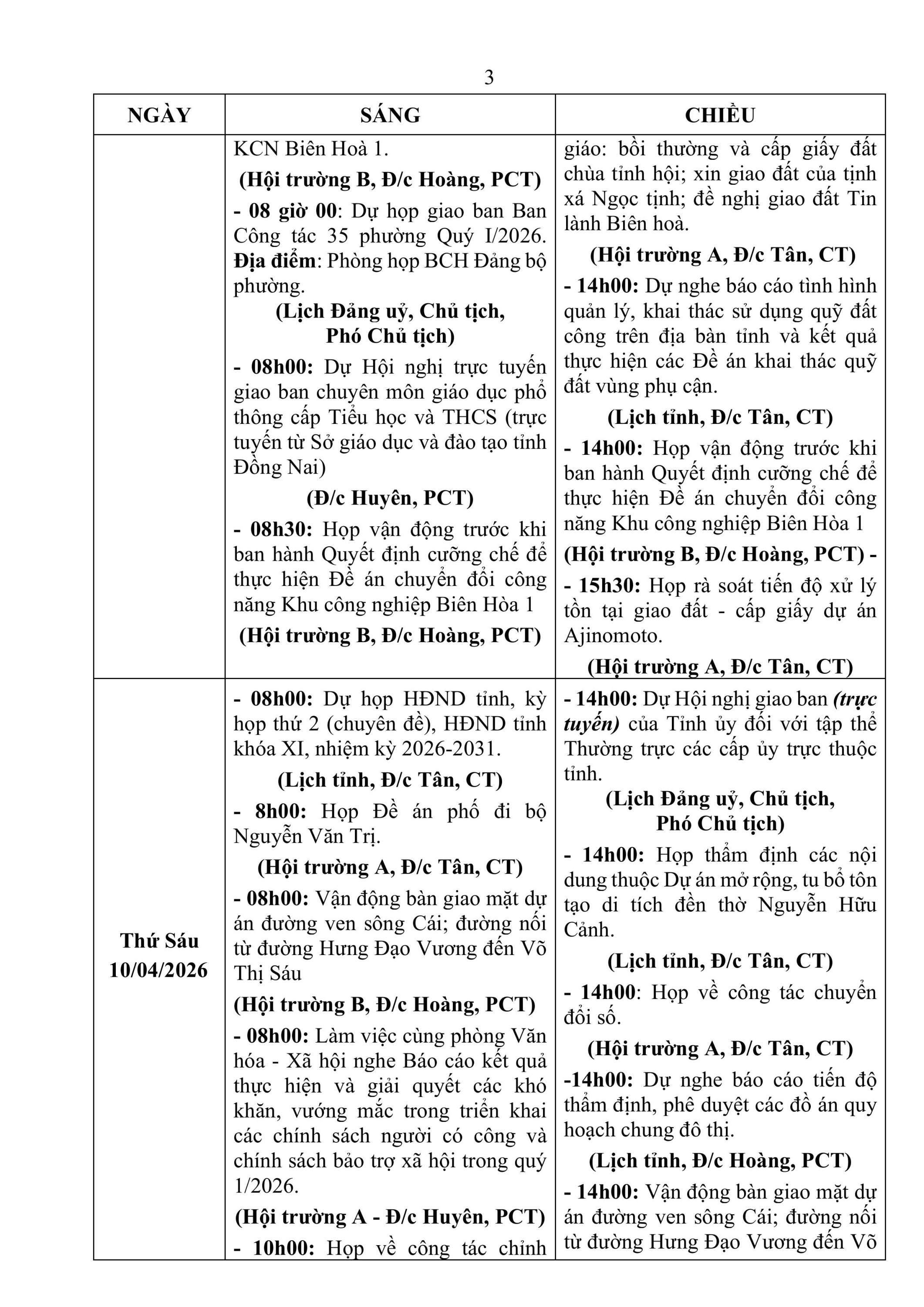 Lịch làm việc của UBND phường Trấn Biên - Tuần 15 (Từ ngày 06/4/2026 đến ngày 11/4/2026)