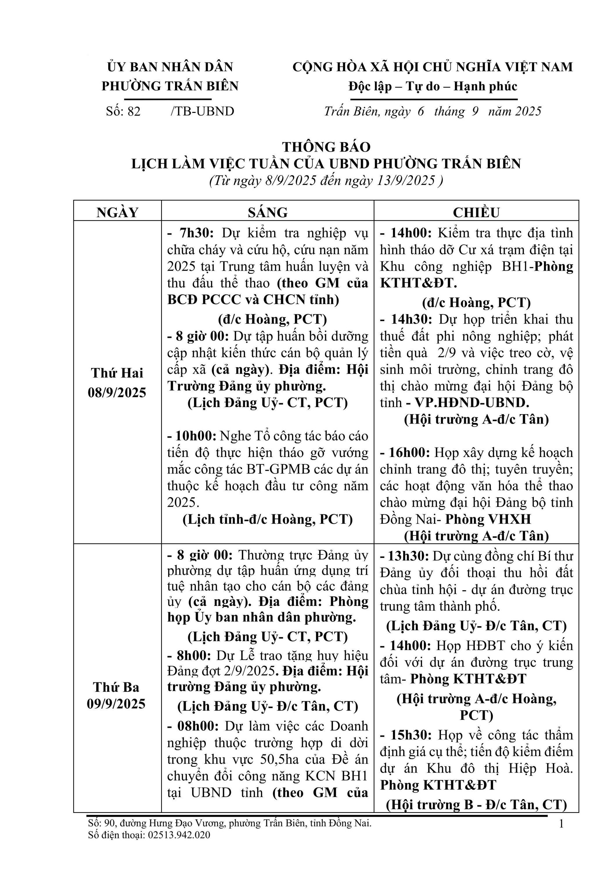 82-TB-UBND: Lịch làm việc của UBND phường Trấn Biên - Tuần 37 (Từ ngày 08/9/2025 đến ngày 14/9/2025).