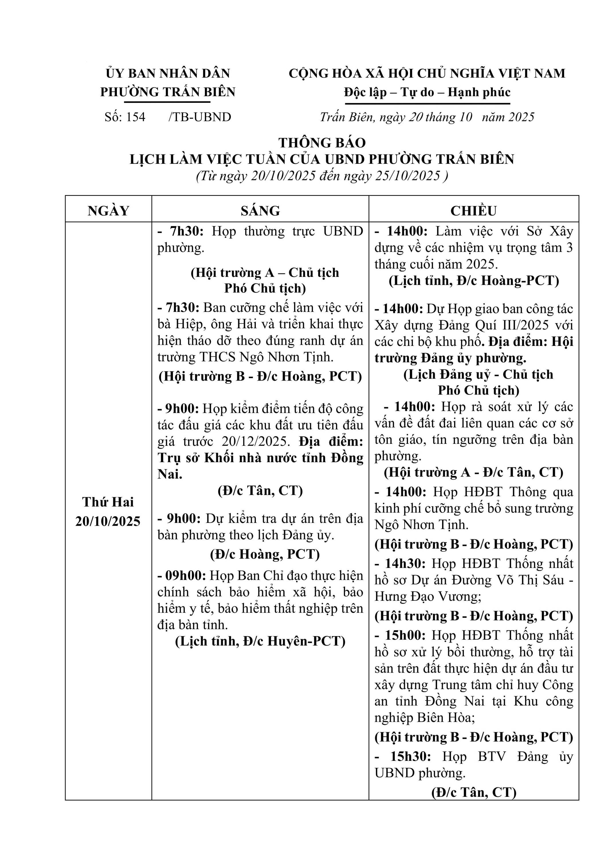 154/TB-UBND: Lịch làm việc của UBND phường Trấn Biên - Tuần 43 (Từ ngày 20/10/2025 đến ngày 26/10/2025)