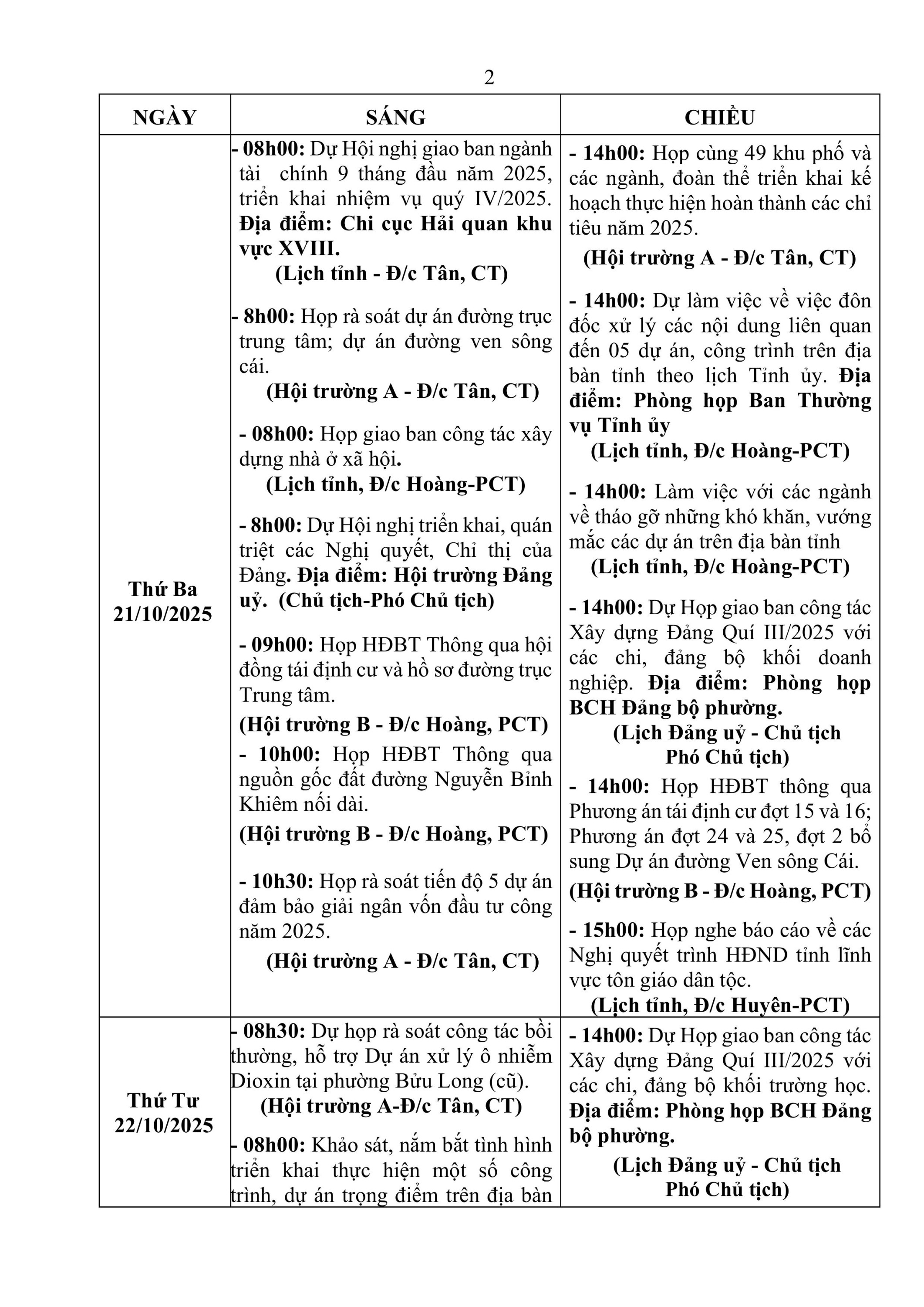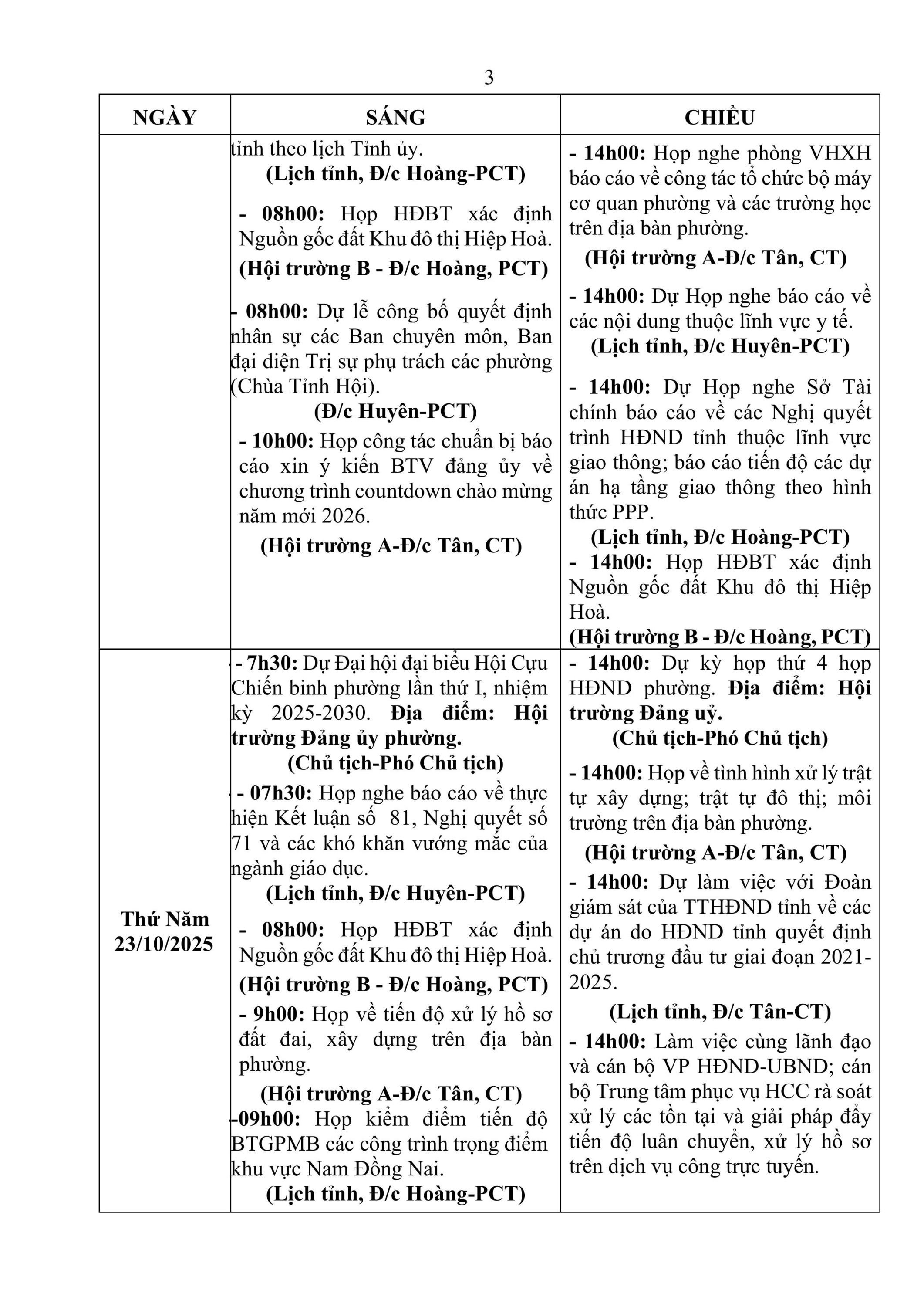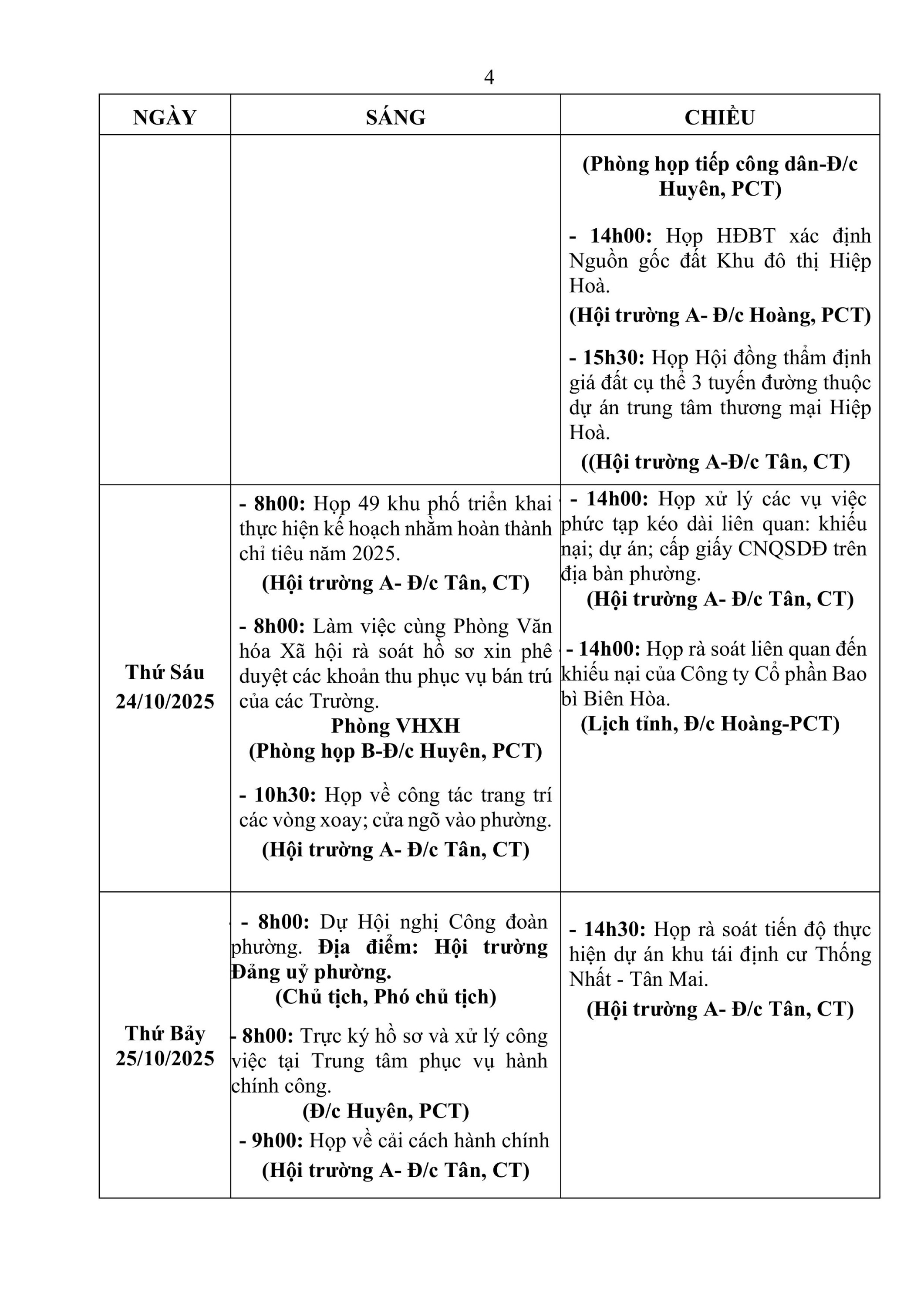 Lịch làm việc của UBND phường Trấn Biên - Tuần 43 (Từ ngày 20/10/2025 đến ngày 26/10/2025)