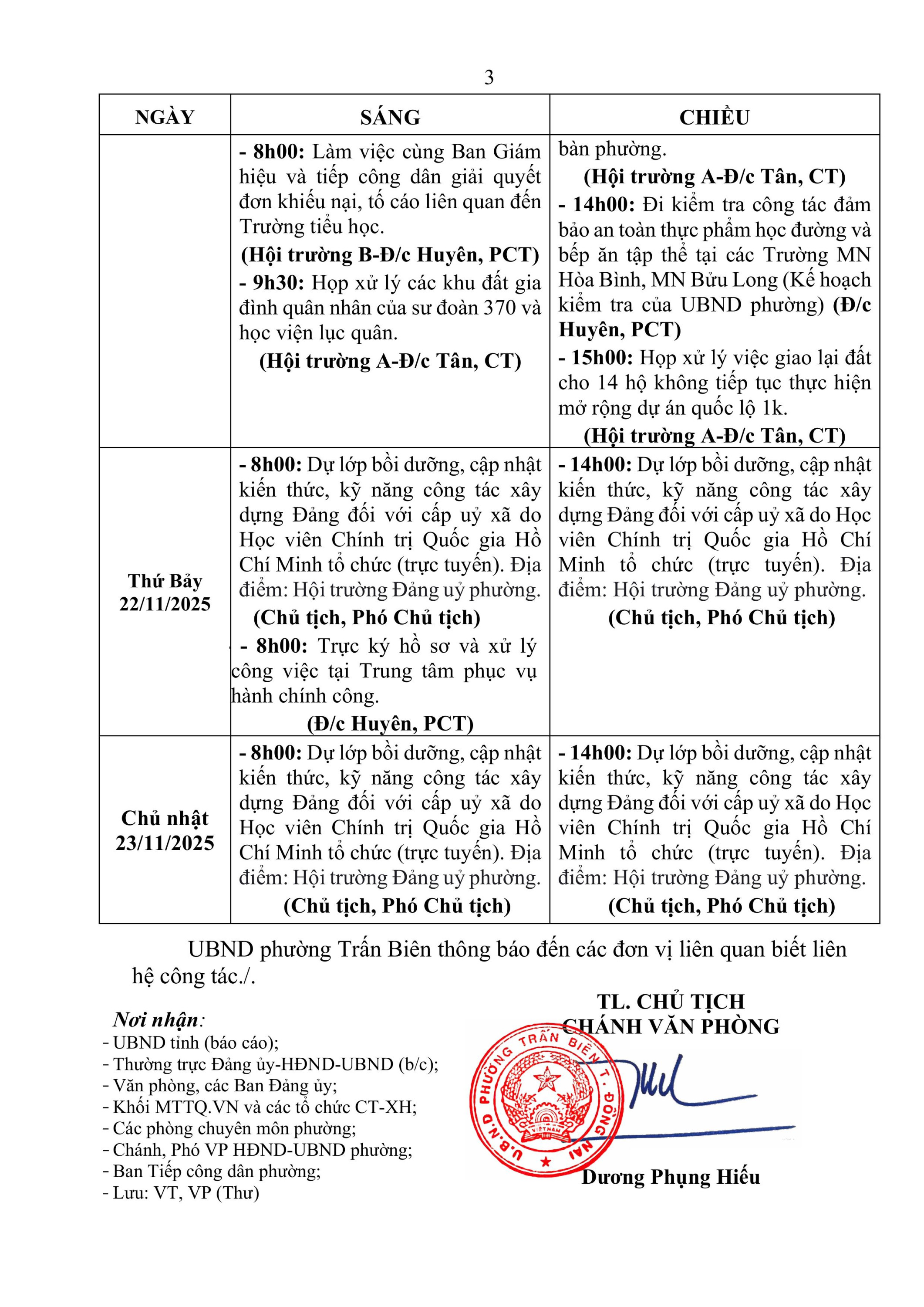 211/TB-UBND: Lịch làm việc của UBND phường Trấn Biên - Tuần 47 (Từ ngày 17/11/2025 đến ngày 22/11/2025)