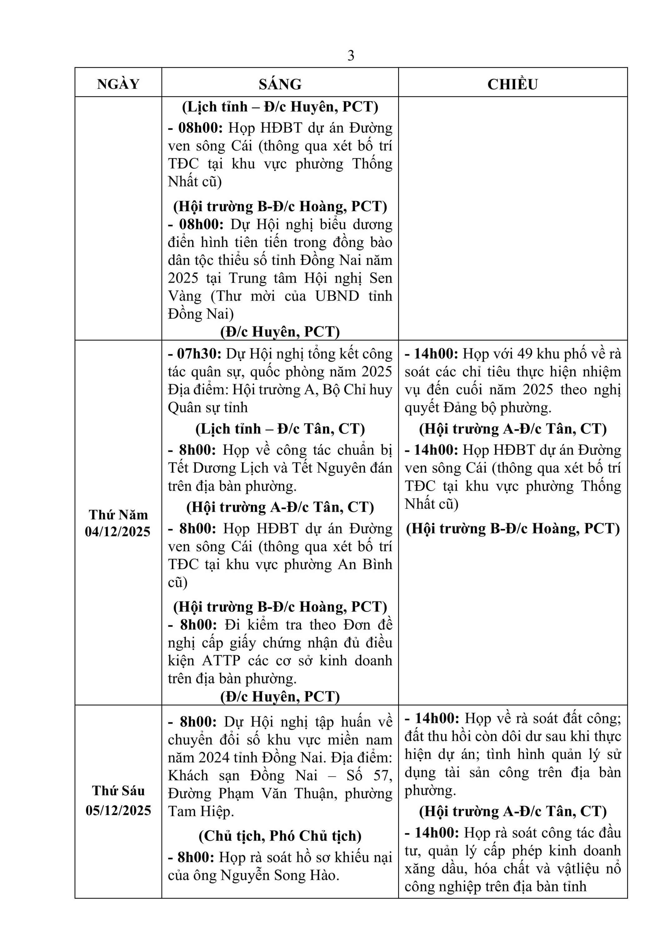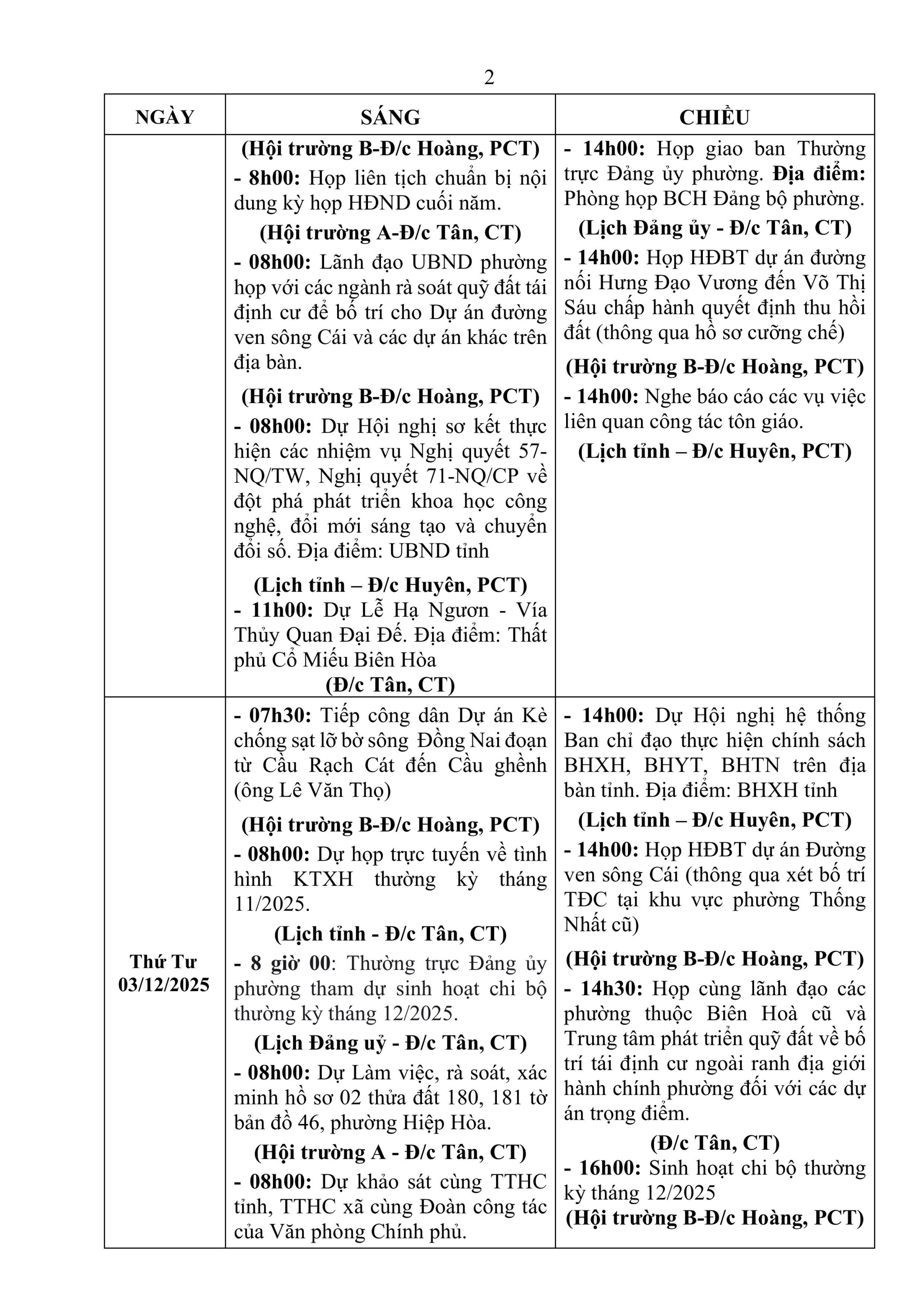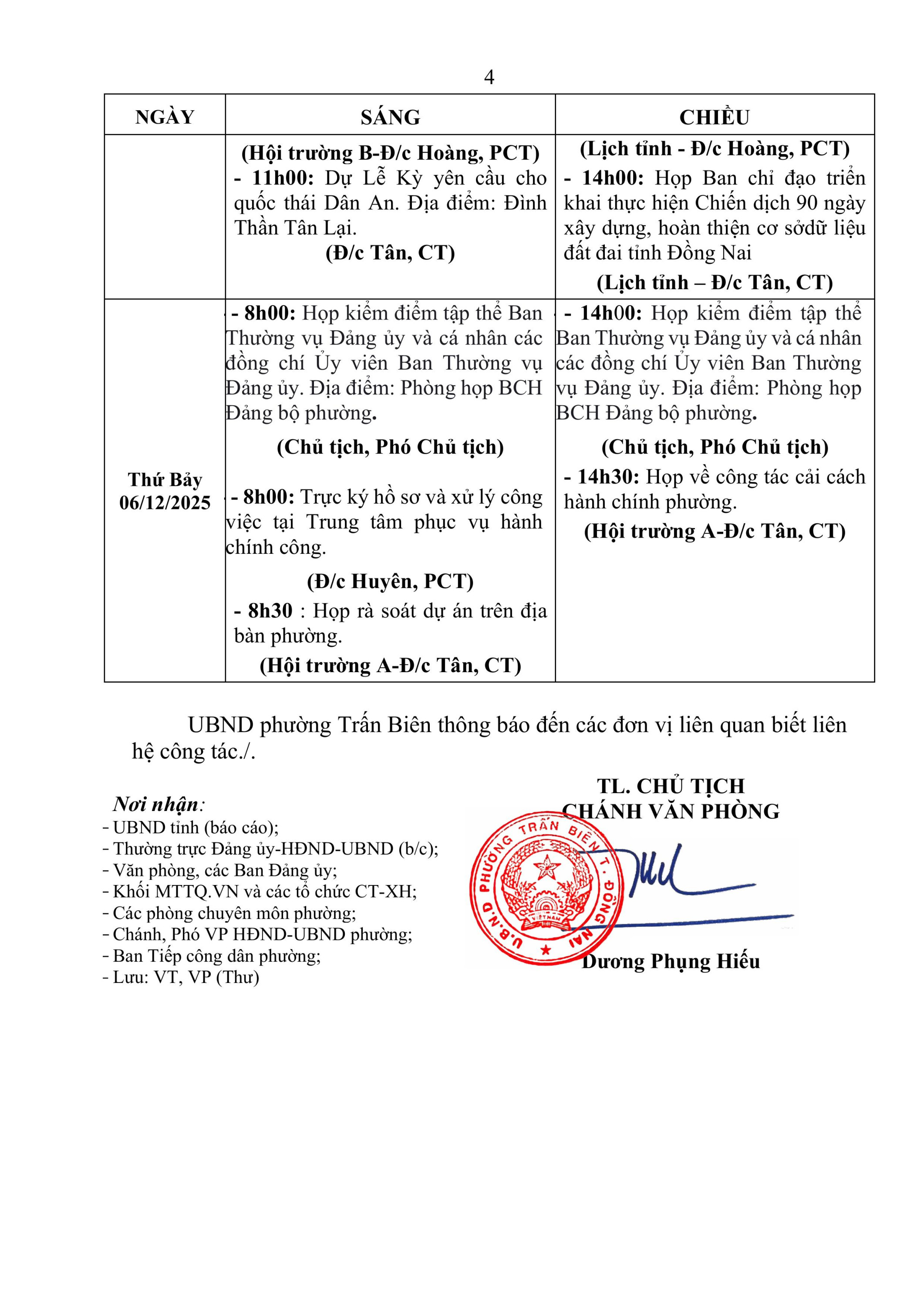 Lịch làm việc của UBND phường Trấn Biên - Tuần 49 (Từ ngày 01/12/2025 đến ngày 06/12/2025)