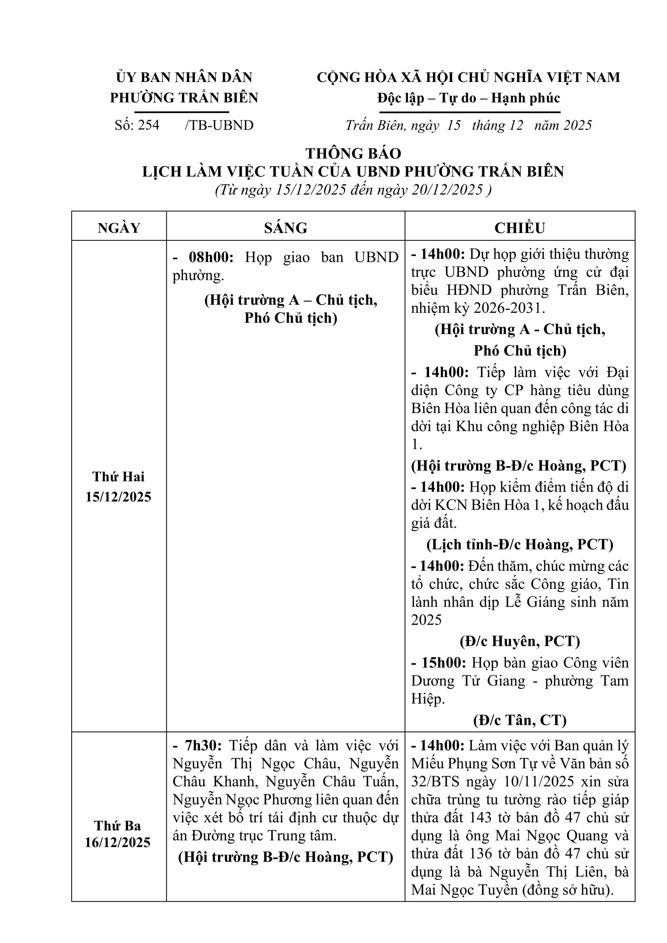 254/TB-UBND: Lịch làm việc của UBND phường Trấn Biên - Tuần 51 (Từ ngày 15/12/2025 đến ngày 20/12/2025)