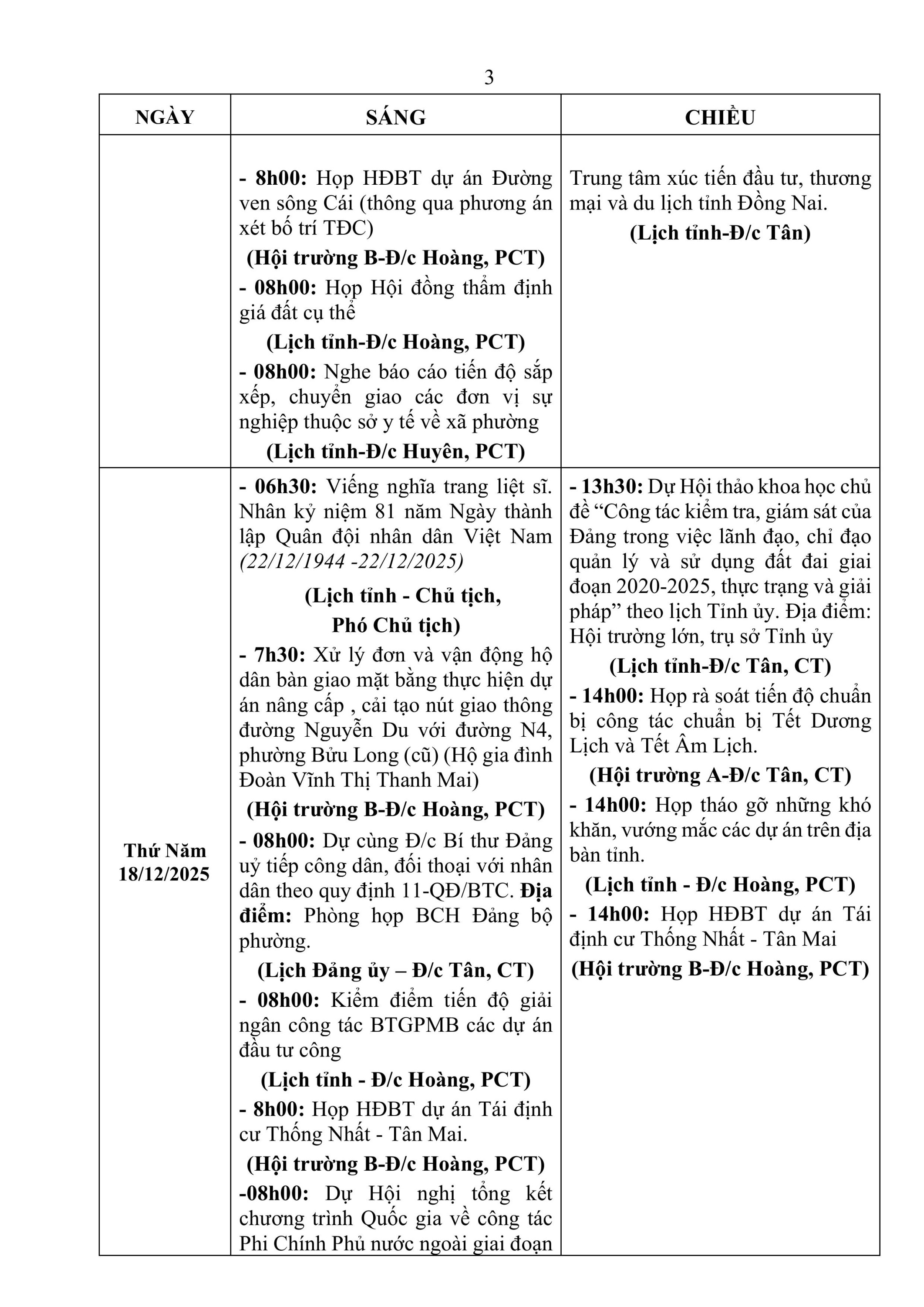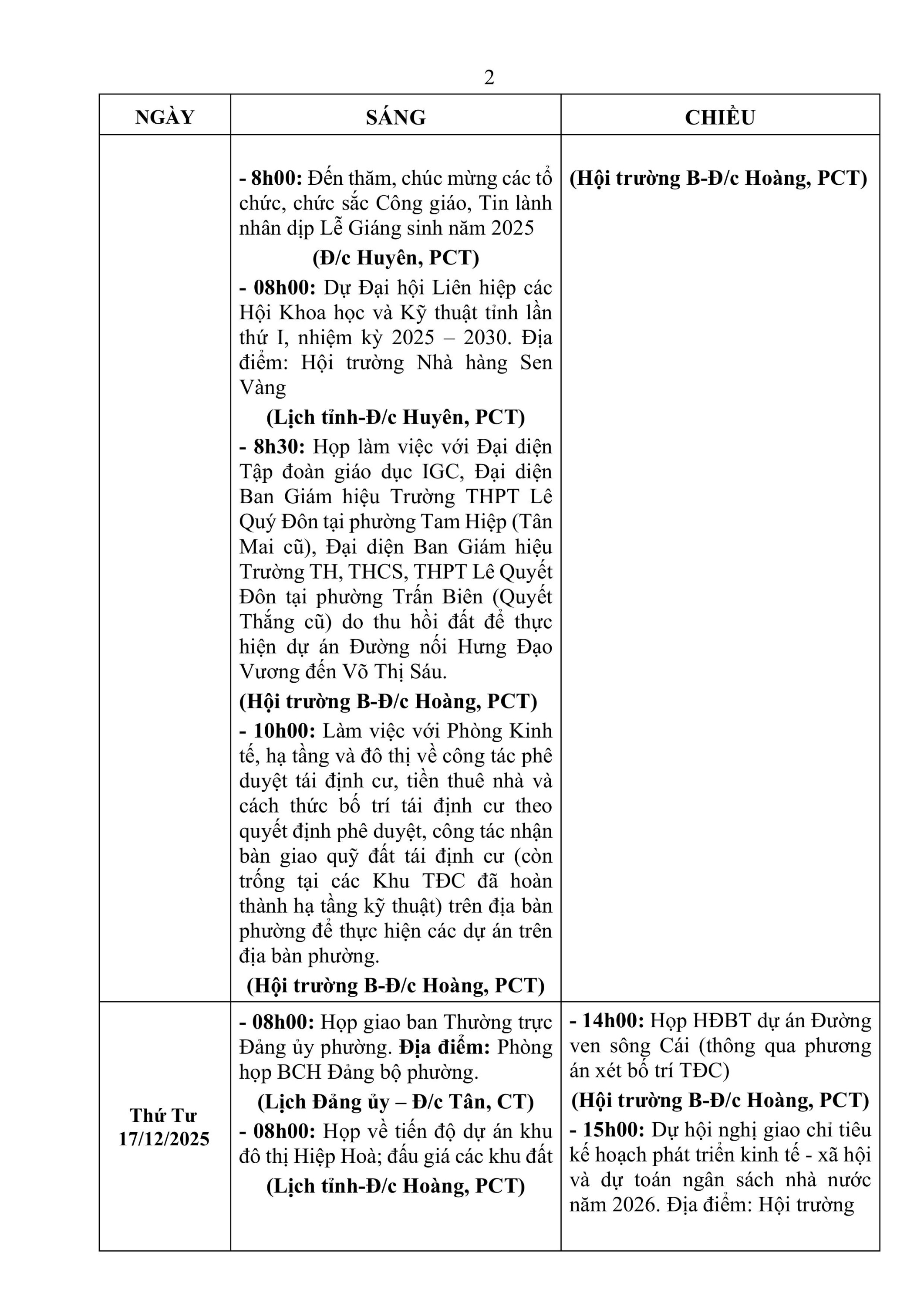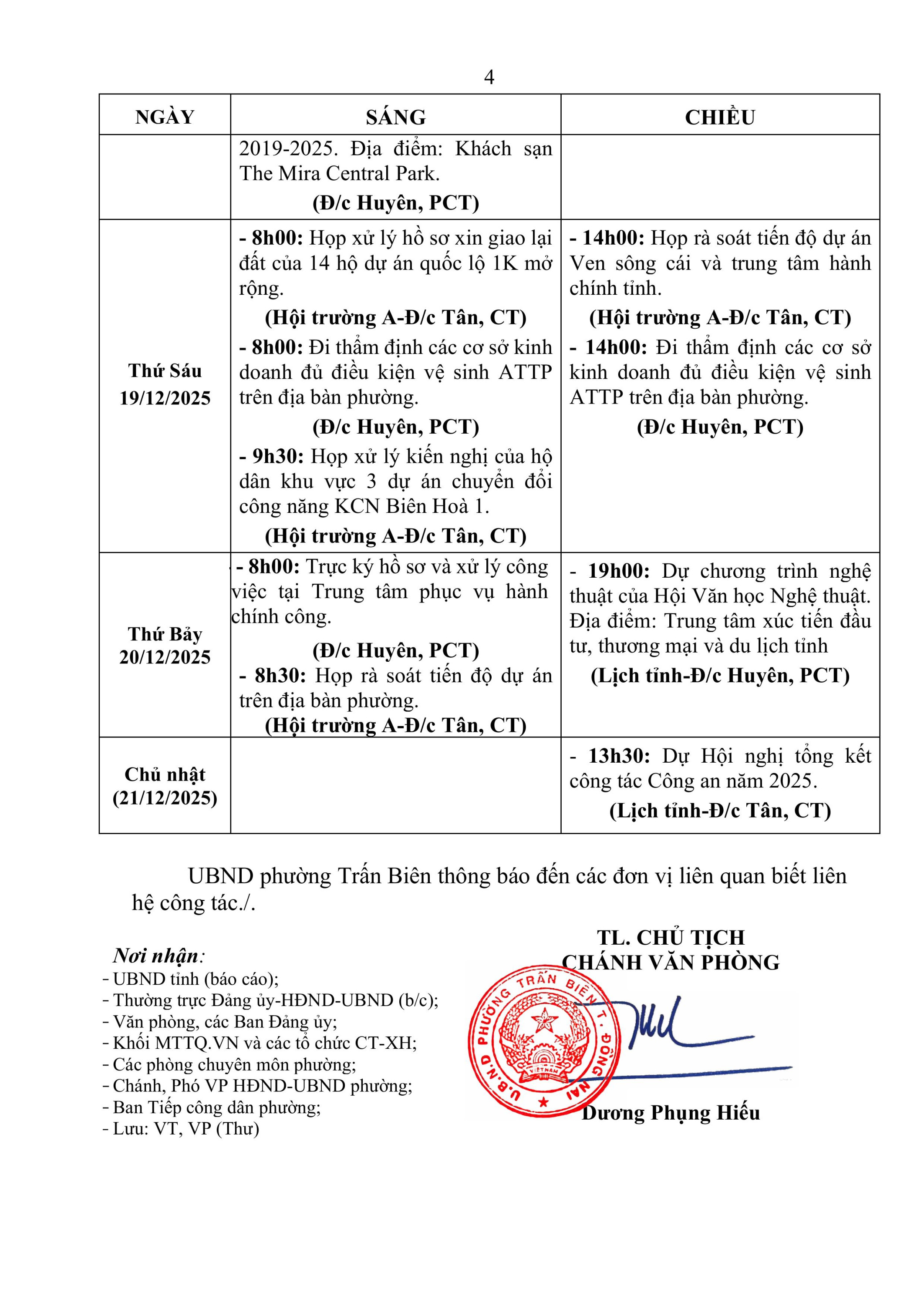 Lịch làm việc của UBND phường Trấn Biên - Tuần 51 (Từ ngày 15/12/2025 đến ngày 20/12/2025)