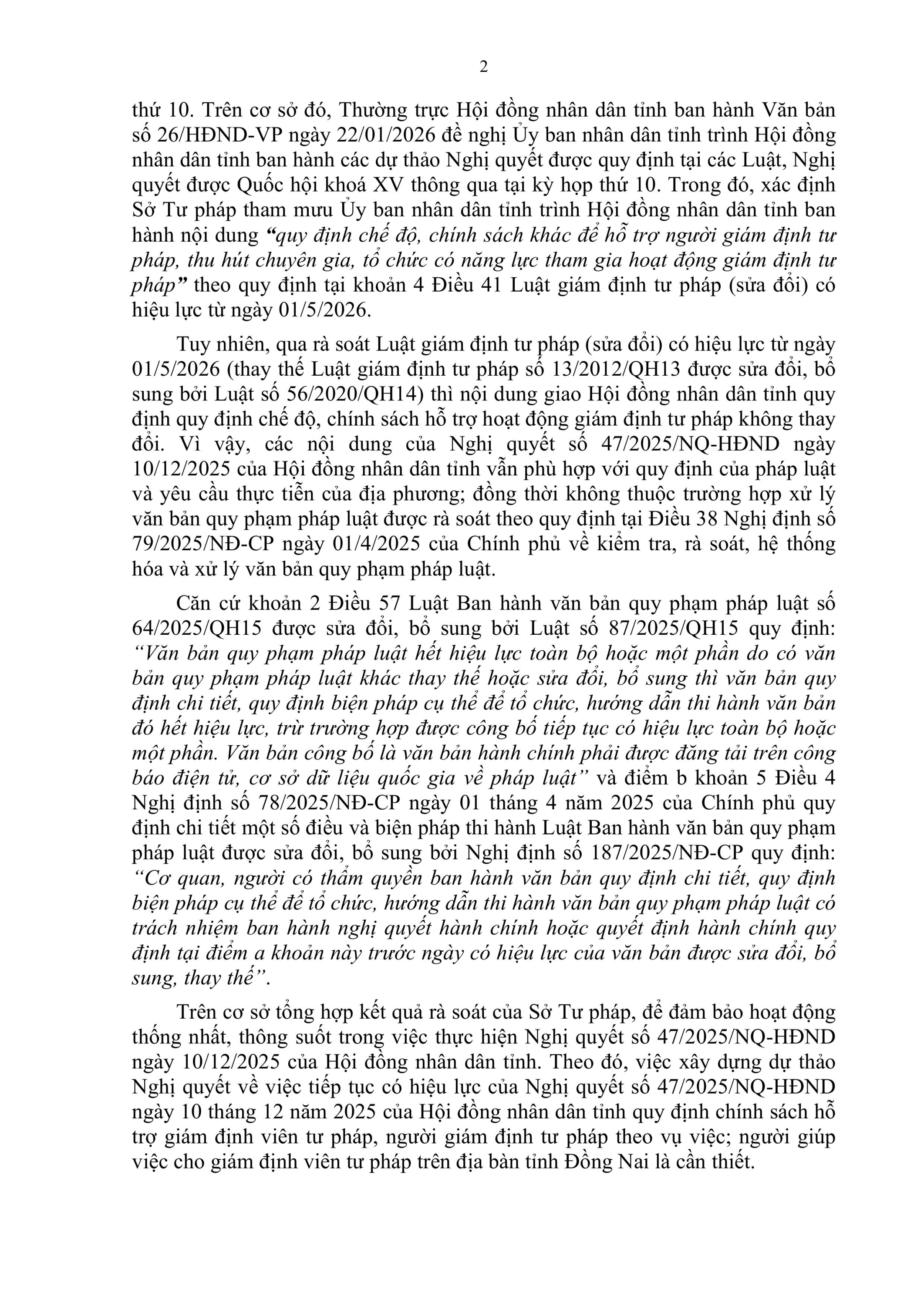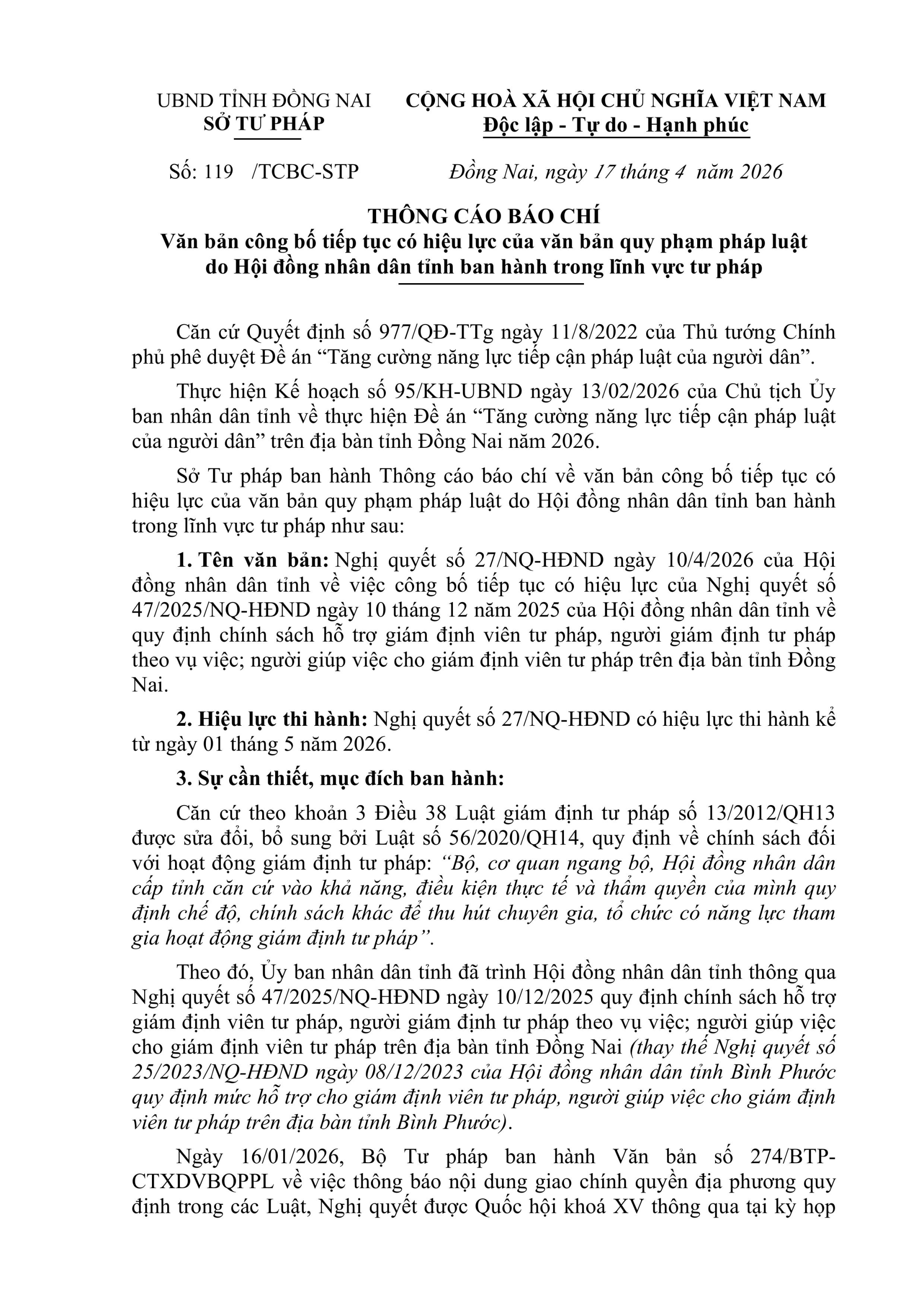 Thông cáo báo chí Nghị quyết số 27/NQ-HĐND ngày 10/4/2026 của Hội đồng nhân dân tỉnh về việc công bố tiếp tục có hiệu lực của Nghị quyết số 47/2025/NQ-HĐND ngày 10 tháng 12 năm 2025 của Hội đồng nhân dân tỉnh về quy định chính sách hỗ trợ giám định viên tư pháp, người giám định tư pháp theo vụ việc; người giúp việc cho giám định viên tư pháp trên địa bàn tỉnh Đồng Nai.
