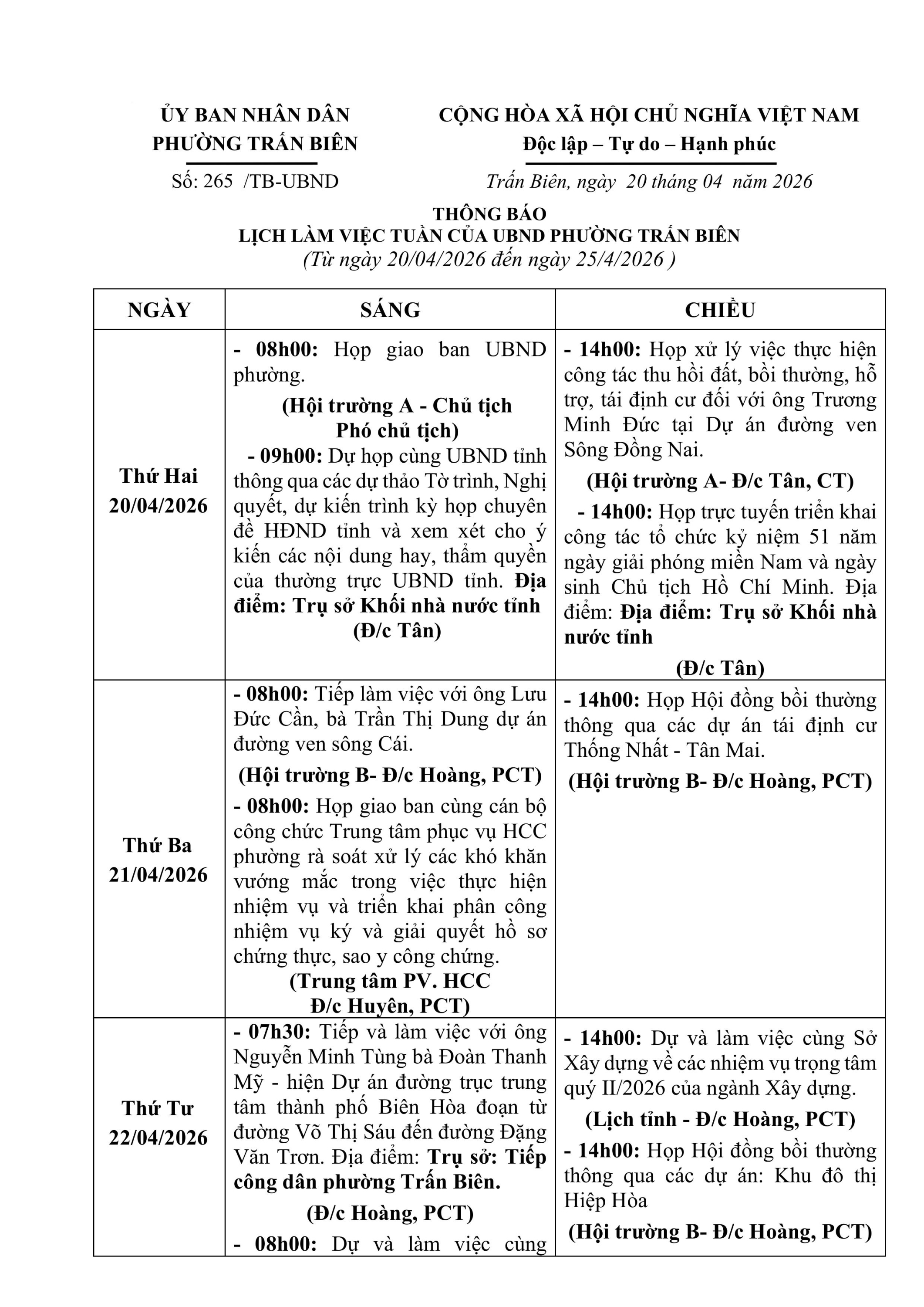 265/TB-UBND: Lịch làm việc của UBND phường Trấn Biên - Tuần 17 (Từ ngày 20/4/2026 đến ngày 25/4/2026)