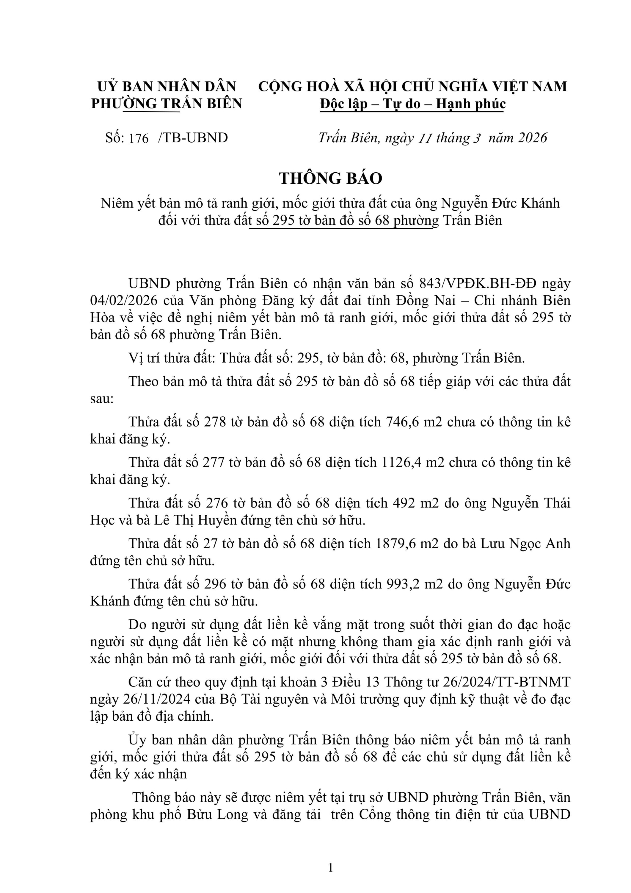 UBND phường Trấn Biên có nhận văn bản số 843/VPĐK.BH-ĐĐ ngày 04/02/2026 của Văn phòng Đăng ký đất đai tỉnh Đồng Nai – Chi nhánh Biên Hòa về việc đề nghị niêm yết bản mô tả ranh giới, mốc giới thửa đất số 295 tờ bản đồ số 68 phường Trấn Biên.