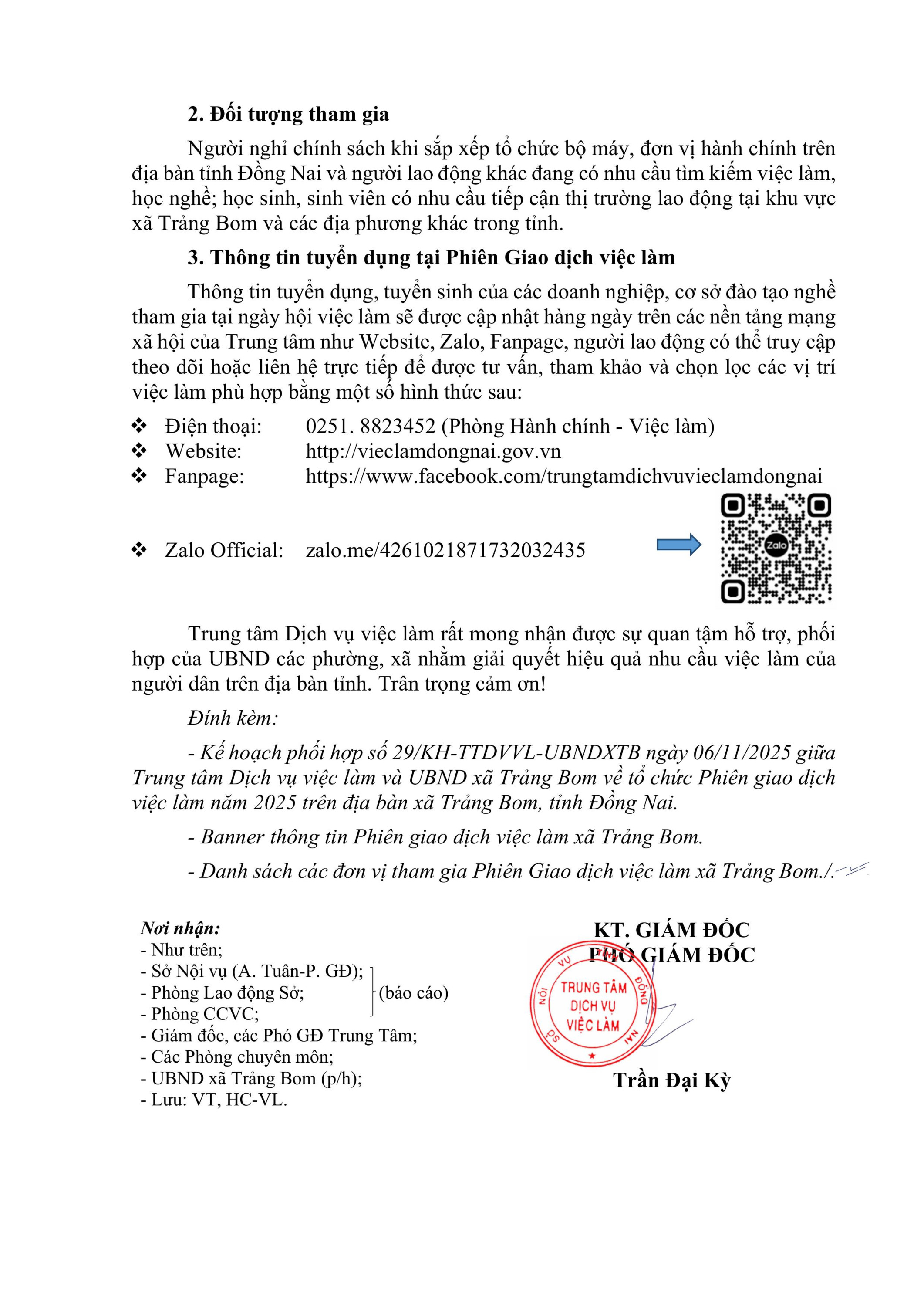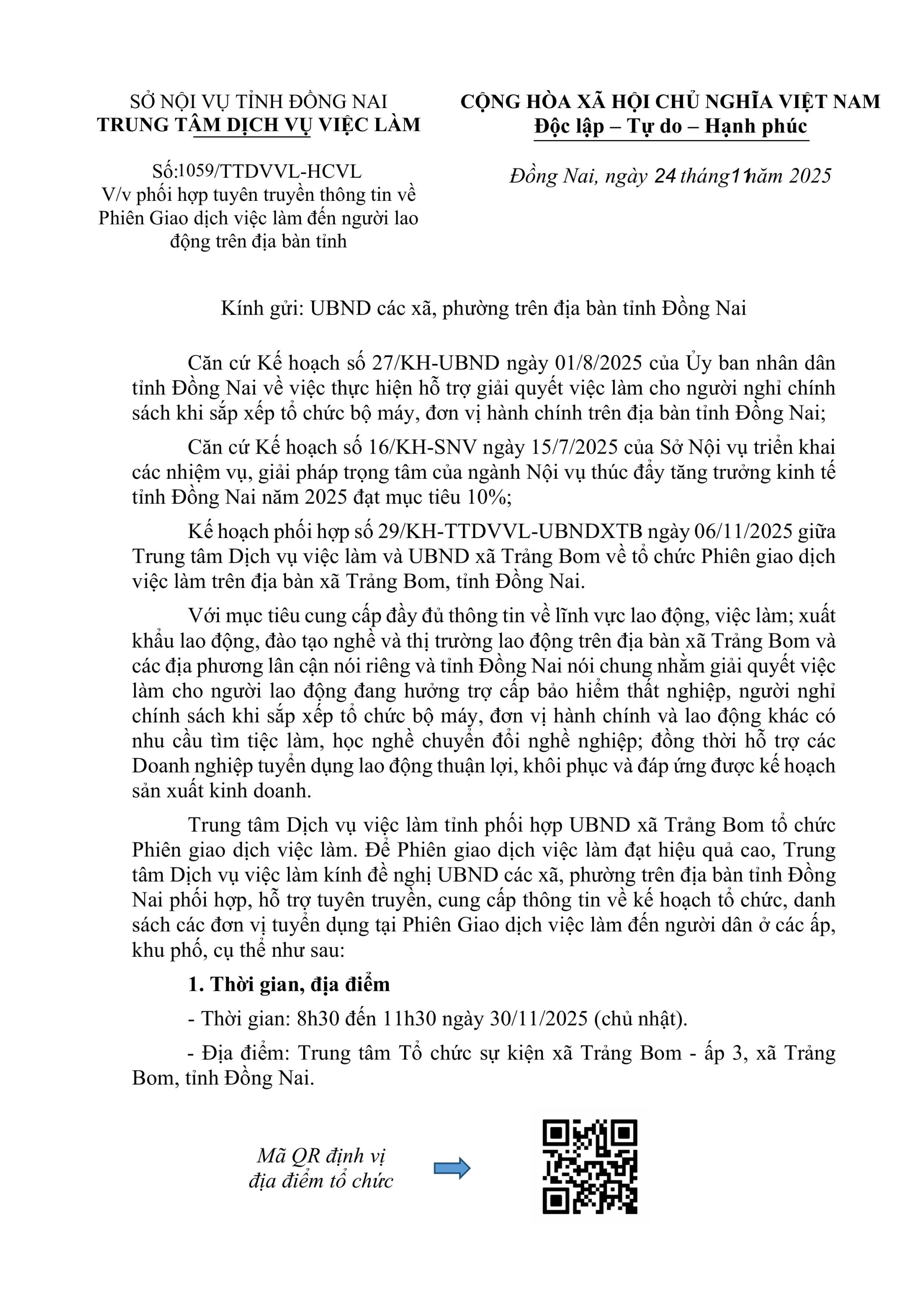 Trung tâm Dịch vụ việc làm tỉnh phối hợp UBND xã Trảng Bom tổ chức Phiên giao dịch việc làm với mục tiêu cung cấp đầy đủ thông tin về lĩnh vực lao động, việc làm; xuất khẩu lao động, đào tạo nghề và thị trường lao động trên địa bàn xã Trảng Bom và các địa phương lân cận.