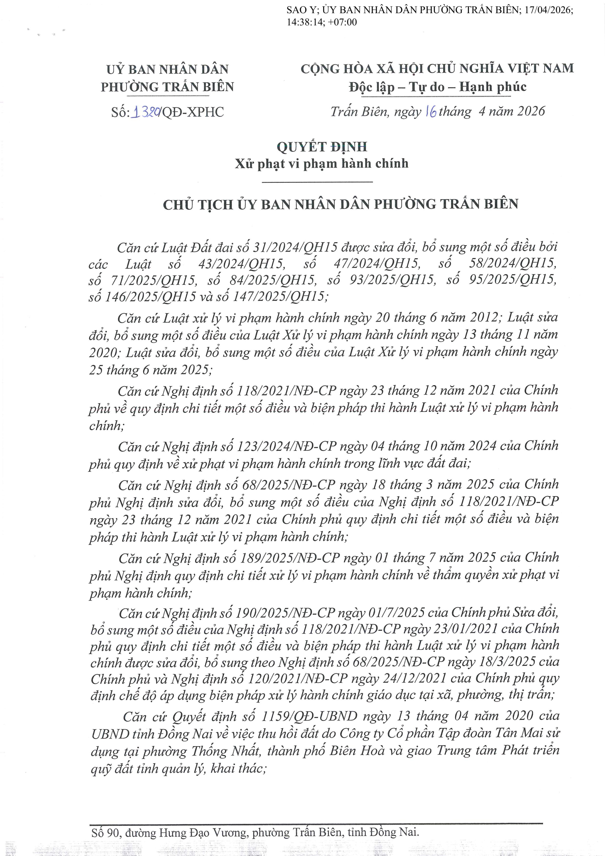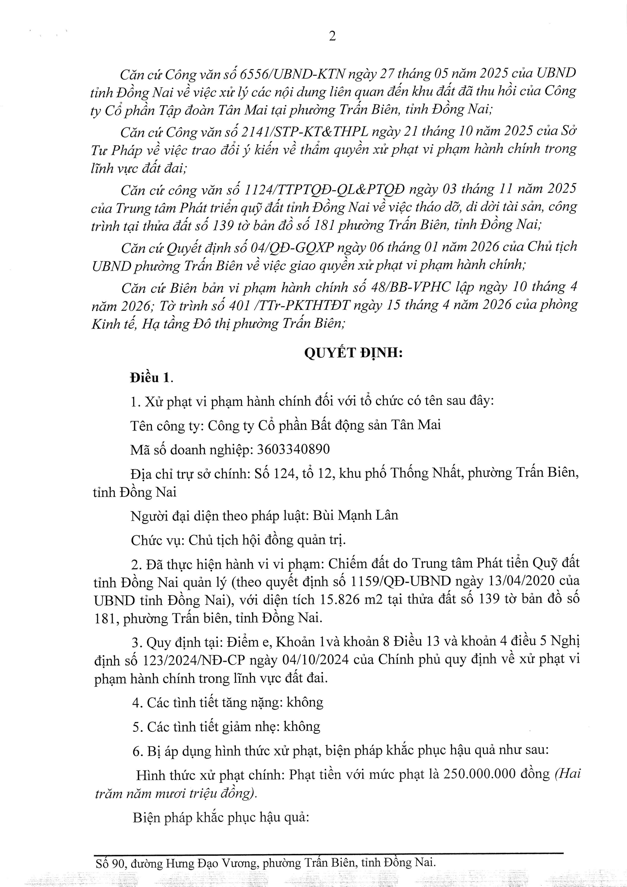 Quyết định xử phạt hành chính Công ty Cổ phần Bất động sản Tân Mai