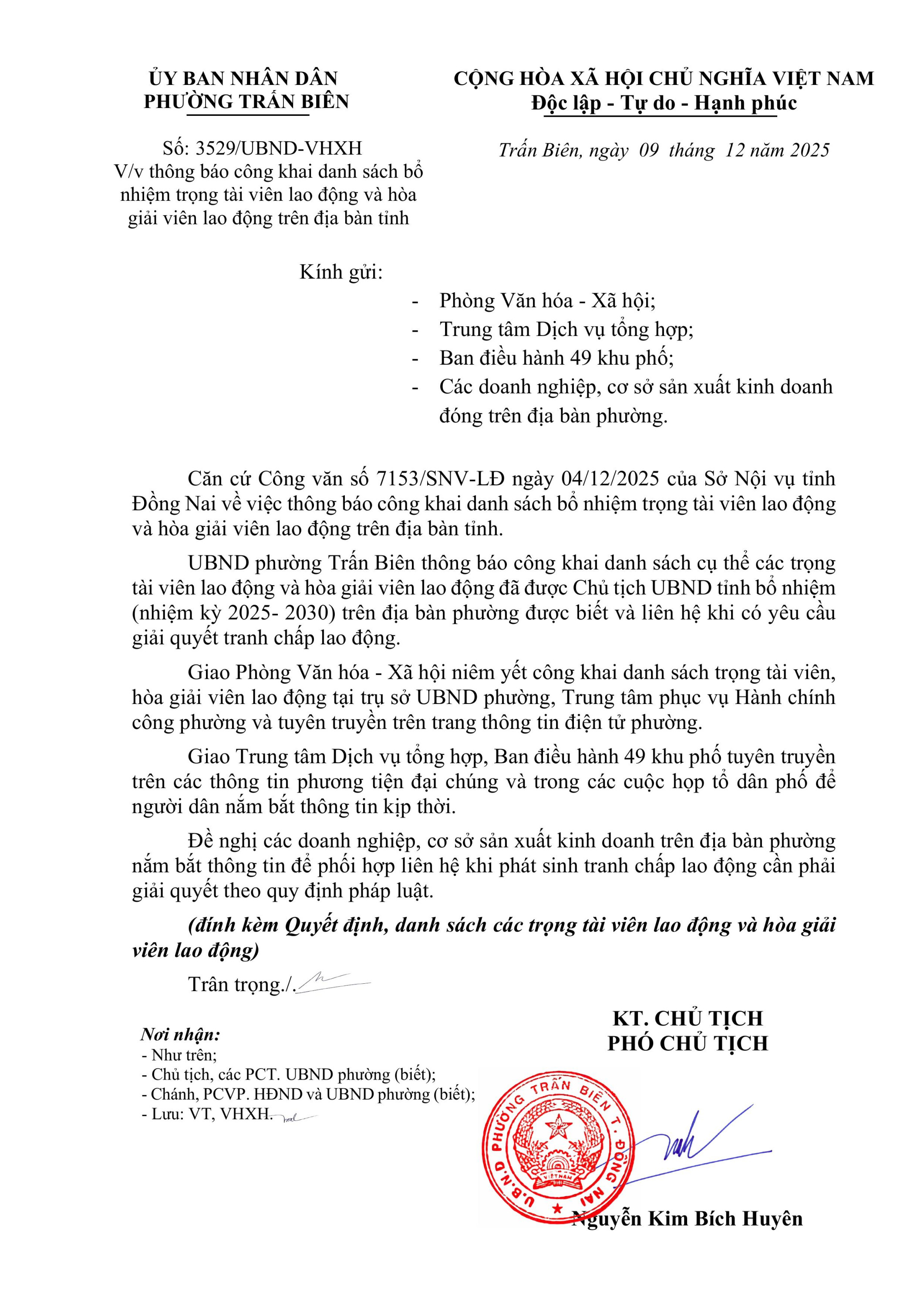 UBND phường Trấn Biên thông báo công khai danh sách cụ thể các trọng tài viên lao động và hòa giải viên lao động đã được Chủ tịch UBND tỉnh bổ nhiệm (nhiệm kỳ 2025- 2030) trên địa bàn phường được biết và liên hệ khi có yêu cầu giải quyết tranh chấp lao động