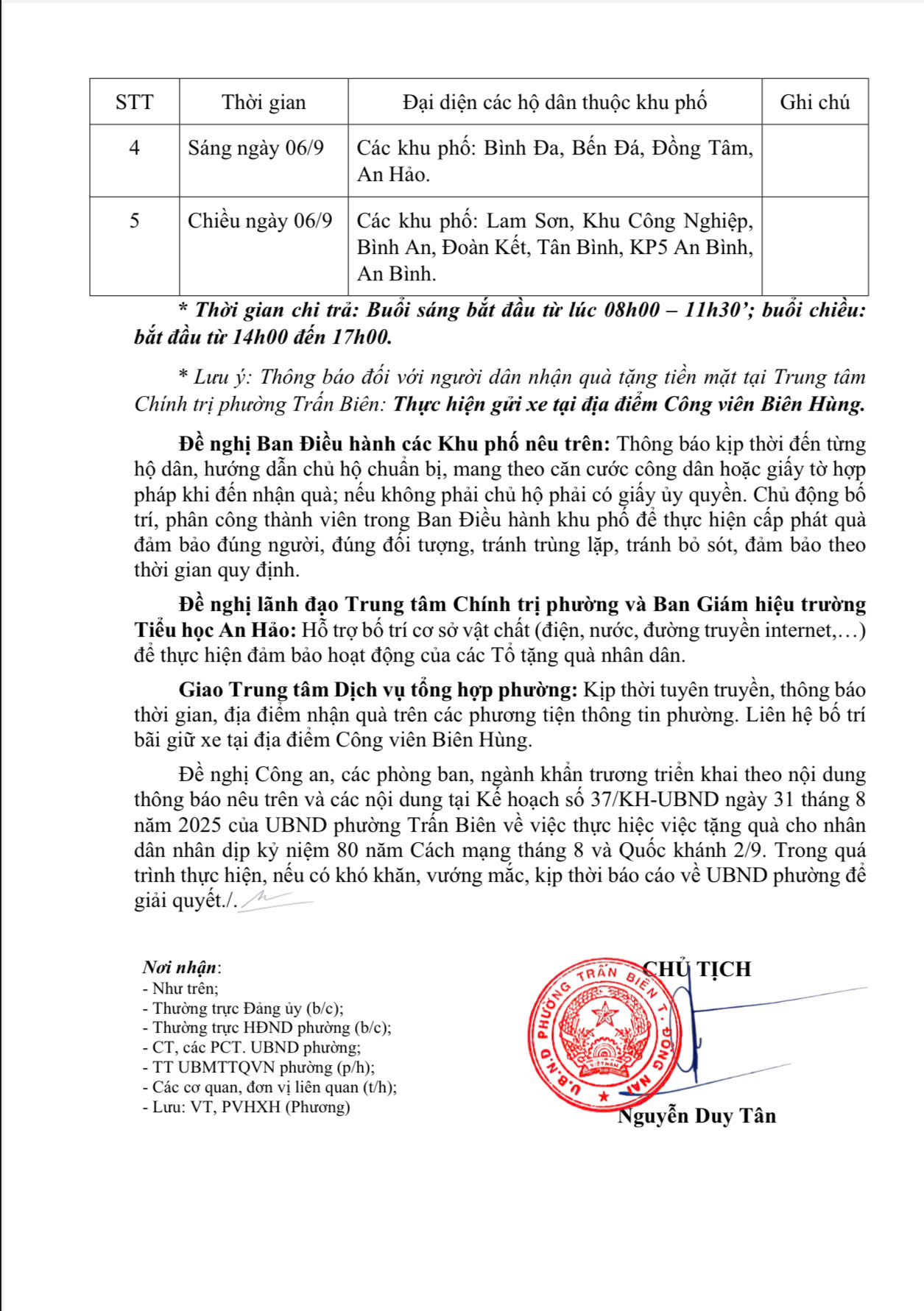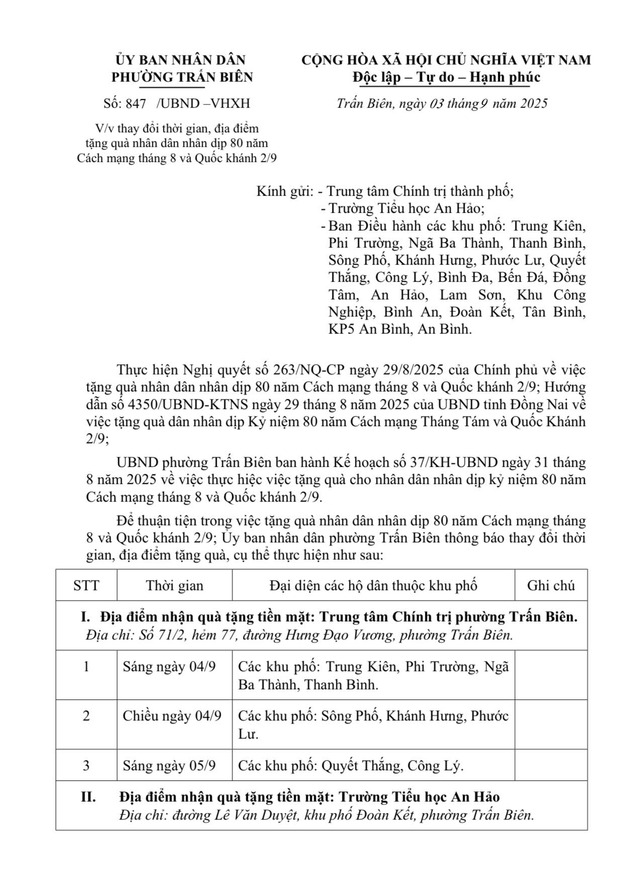 Để thuận tiện trong việc tặng quà nhân dân nhân dịp 80 năm Cách mạng tháng 8 và Quốc khánh 2/9; Ủy ban nhân dân phường Trấn Biên thông báo thay đổi thời gian, địa điểm tặng quà, cụ thể thực hiện như sau: