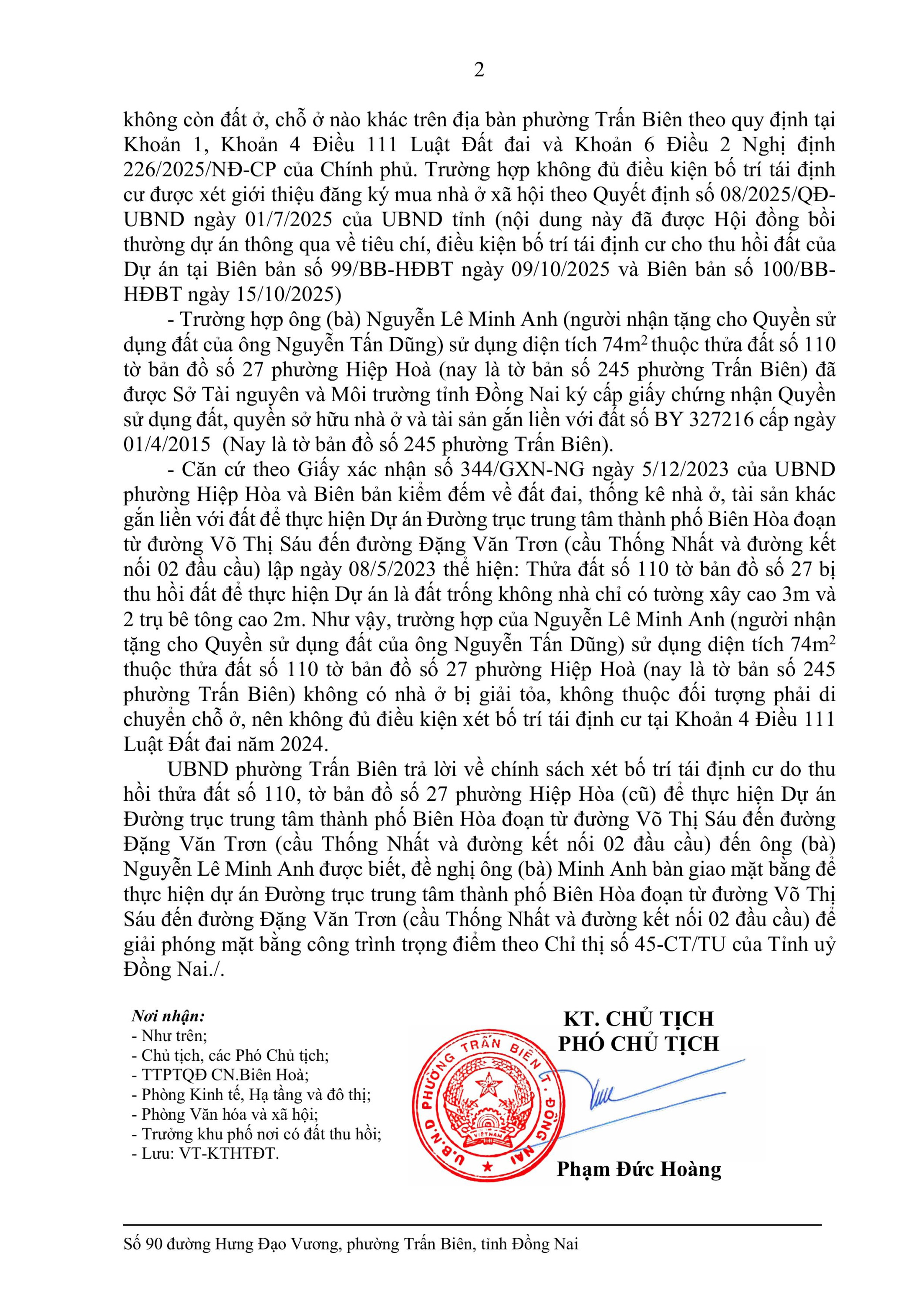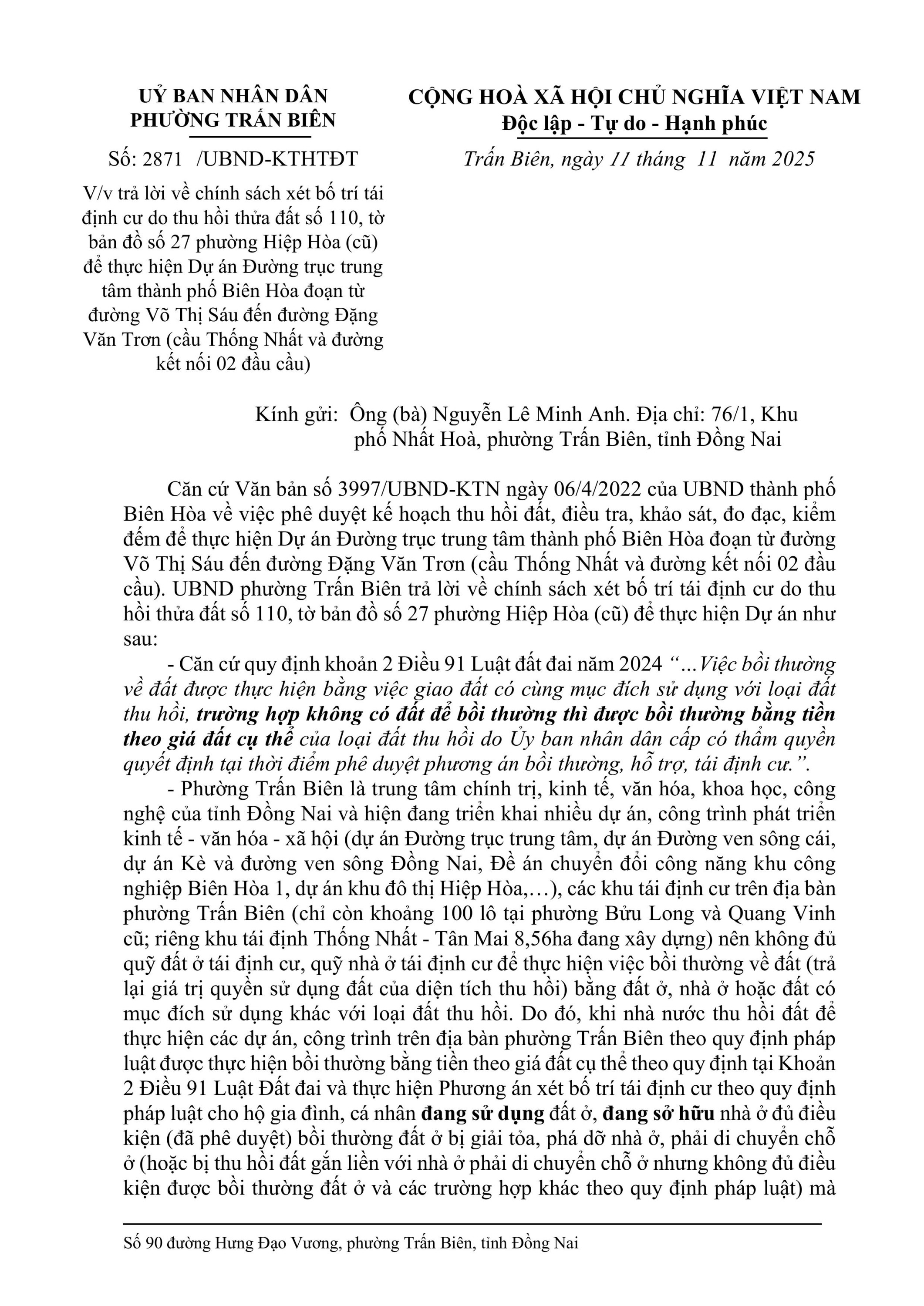Trả lời về chính sách xét bố trí tái định cư do thu hồi thửa đất số 110, tờ bản đồ số 27 phường Hiệp Hòa (cũ) để thực hiện Dự án Đường trục trung tâm thành phố Biên Hòa đoạn từ đường Võ Thị Sáu đến đường Đặng Văn Trơn