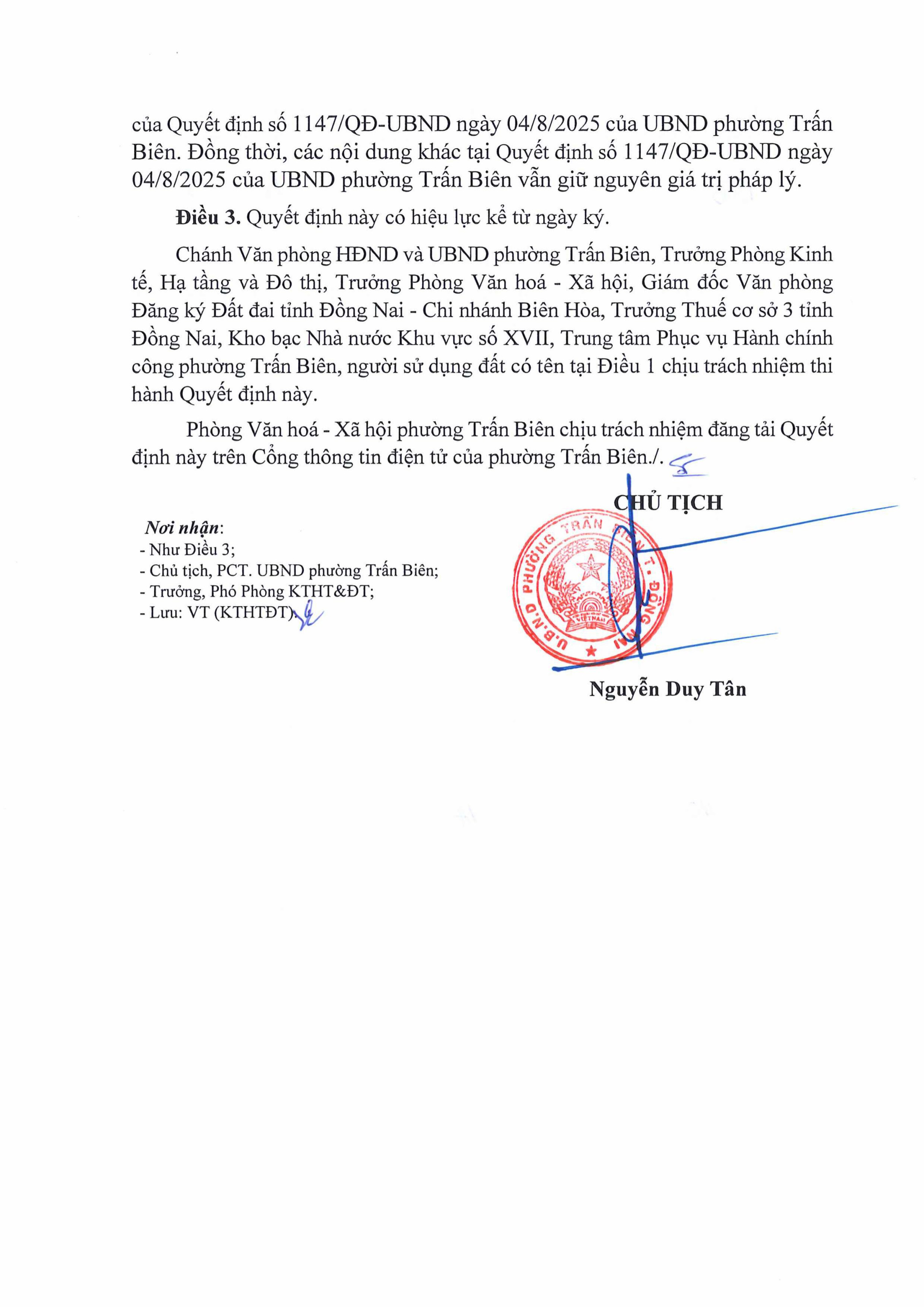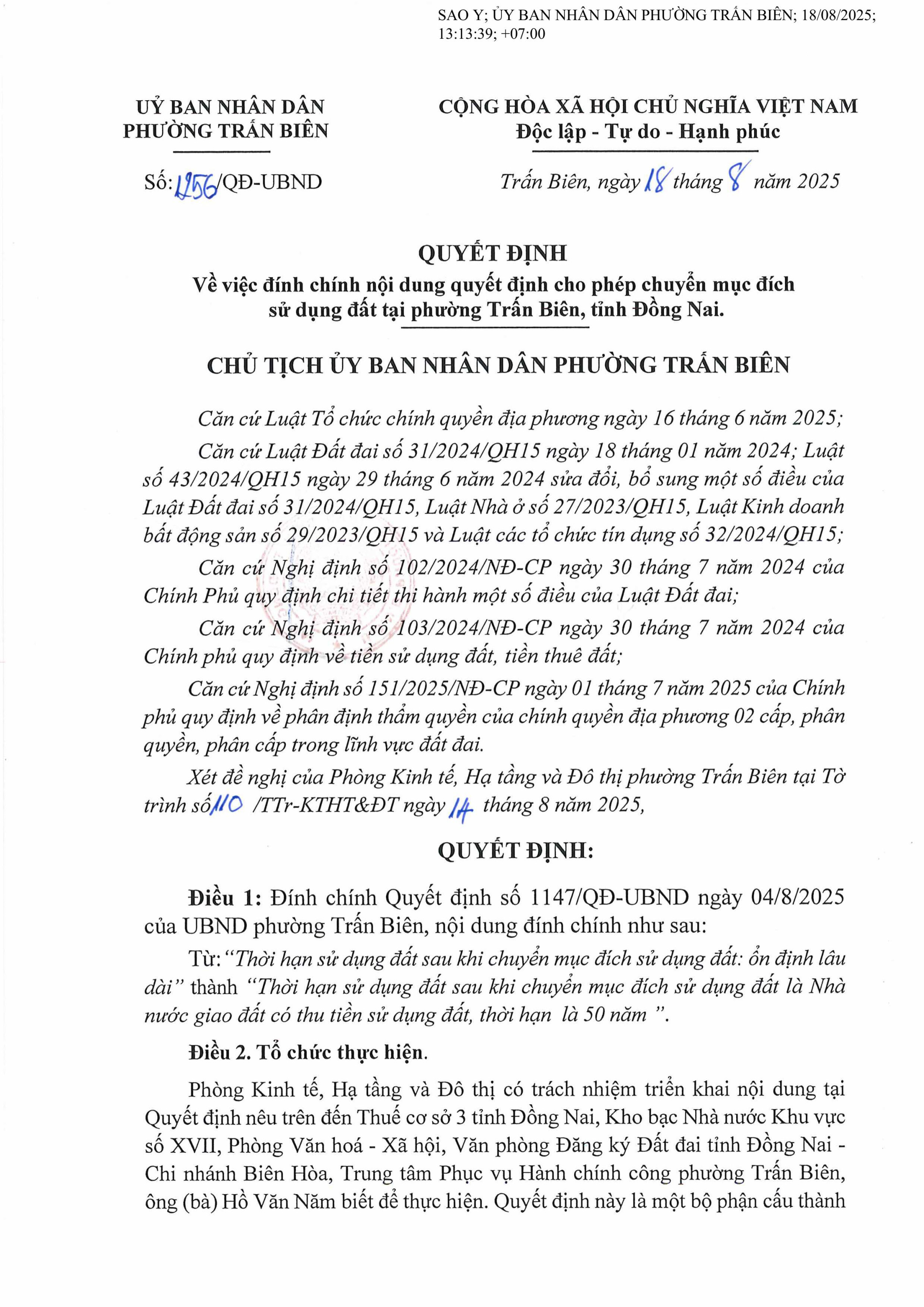 1256/QĐ-UBND: Về việc đính chính nội dung quyết định cho phép chuyển mục đích sử dụng đất tại phường Trấn Biên, tỉnh Đồng Nai.