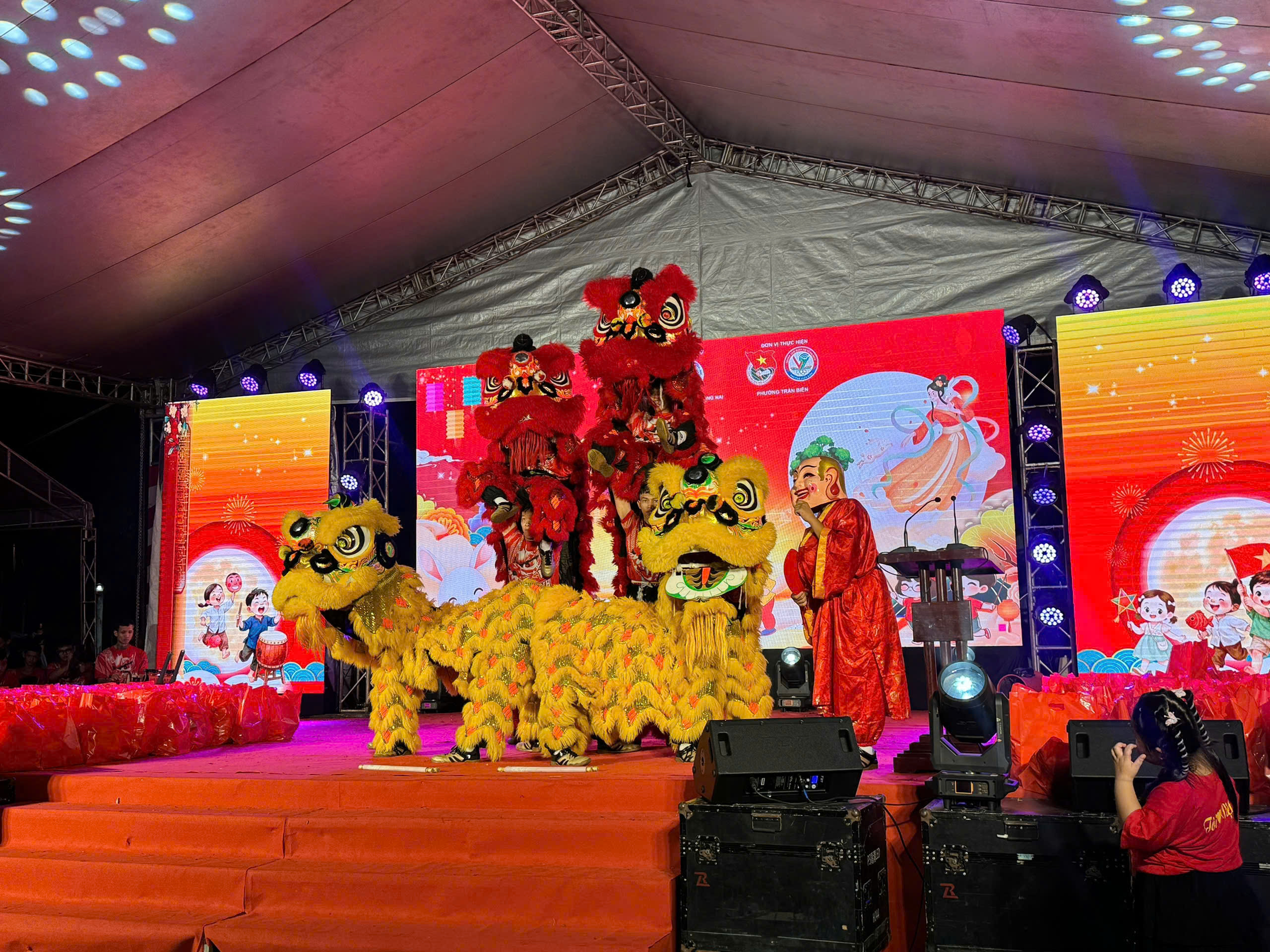 Ngay từ 18 giờ 45 phút, công viên Biên Hùng đã tràn ngập tiếng cười hồn nhiên của hàng trăm em nhỏ cùng phụ huynh. Tiết mục múa lân Trung thu mở màn sôi động đã khuấy động bầu không khí, tạo nên sự hào hứng cho các em thiếu nhi.